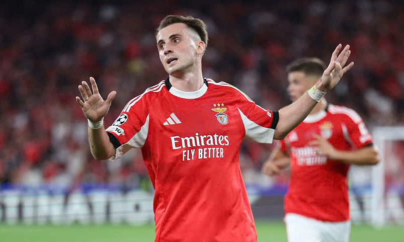 Midfielder Kerem Akturkoglu celebrates his winning goal for Benfica against Fenerbahce in the Champions League playoff second leg at Da Luz stadium in Lisbon, Portugal on Tuesday 27/8/2025. Photo: AFP |