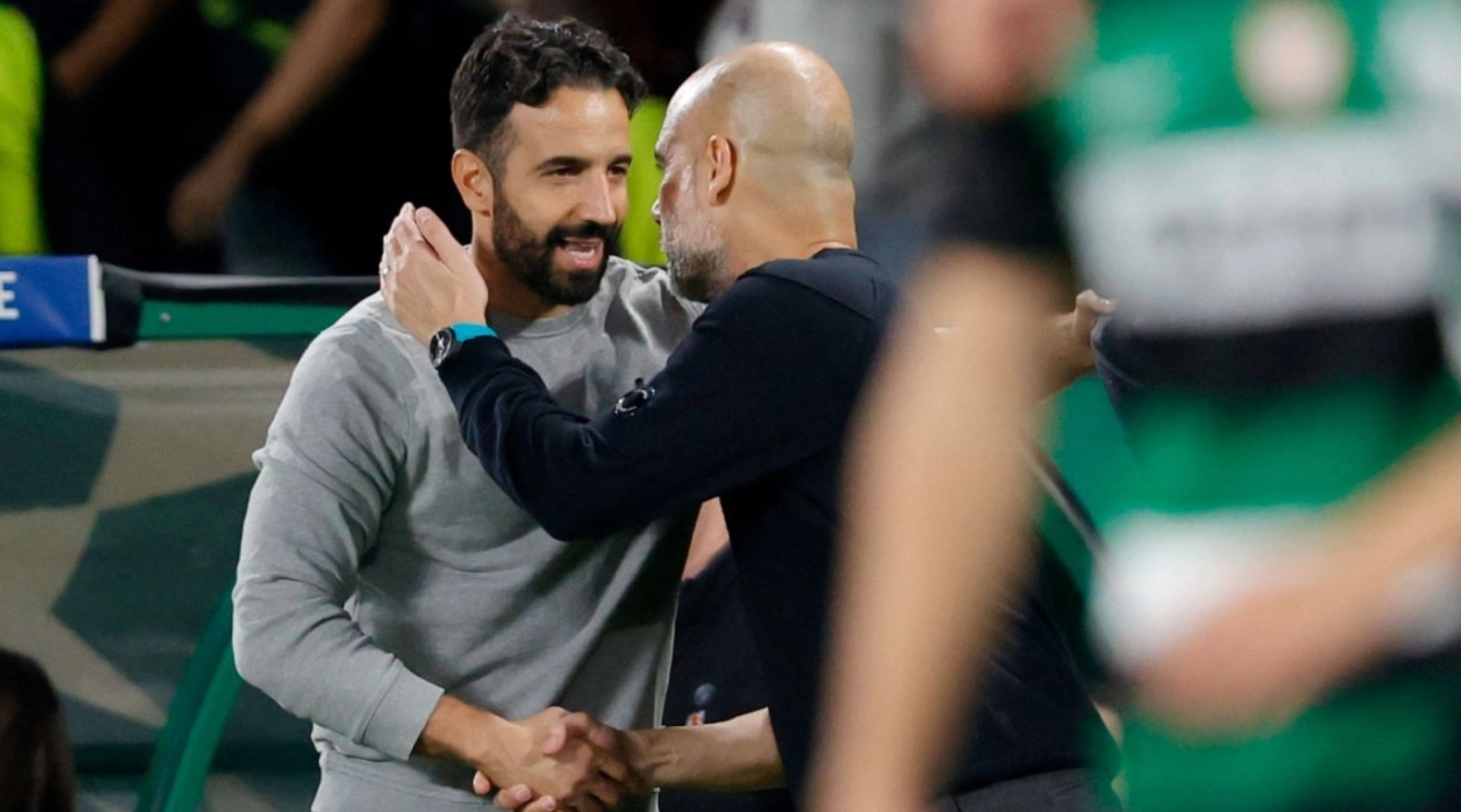 Manager Ruben Amorim (left) shakes hands with Pep Guardiola after Sporting beat Man City 4-1 in the fourth round of the Champions League in November 2024. Photo: AFP