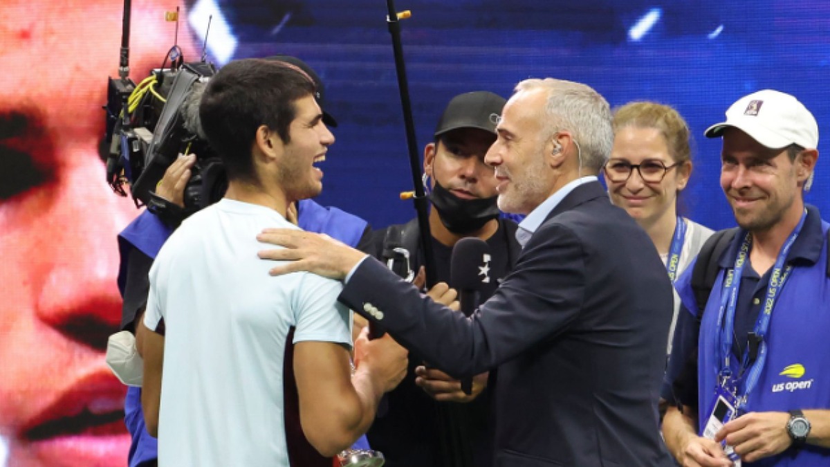 Corretja (right) congratulates Alcaraz at the 2022 US Open, after the final at Arthur Ashe Stadium, New York. Photo: PDB