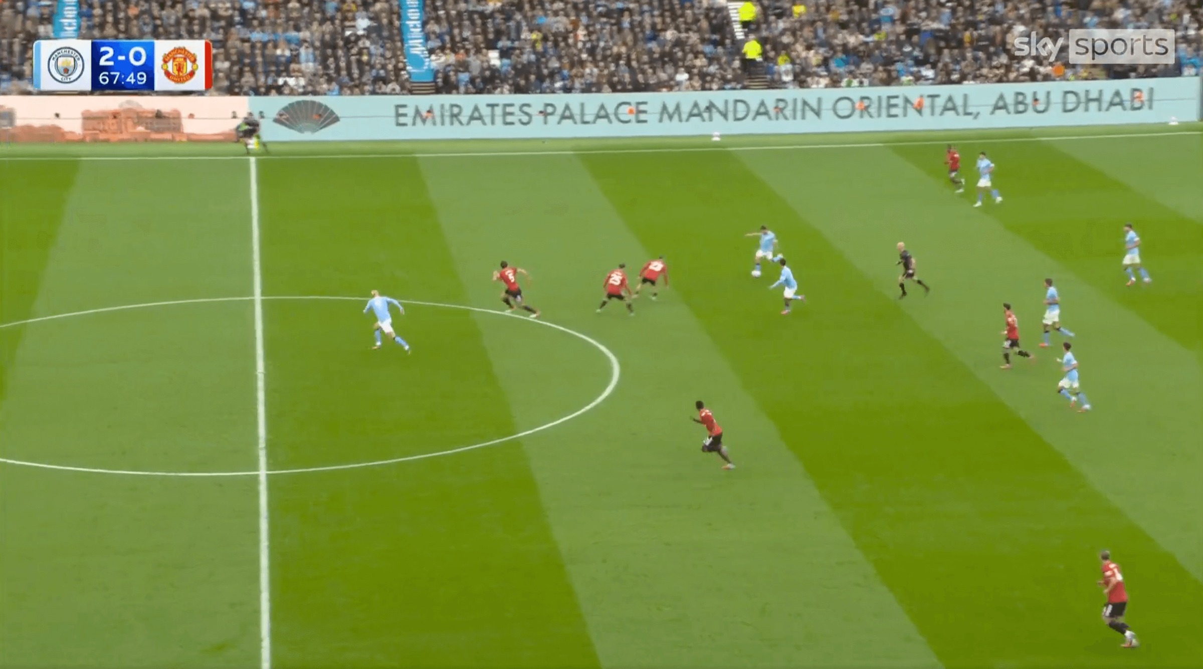 Four Man Utd players (red) leave Haaland unmarked in the 68th minute at Etihad Stadium, allowing the Norwegian striker to score and make it 3-0. Image: Sky |