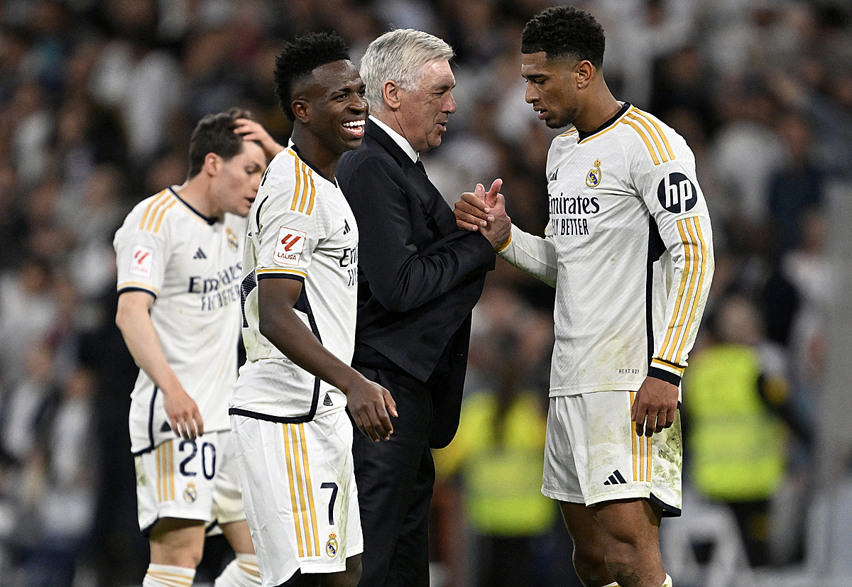 Coach Ancelotti while leading Real. He is shaking hands with Jude Bellingham after their victory against Barca in La Liga's 32nd round on 21/4/2024. Photo: AFP |