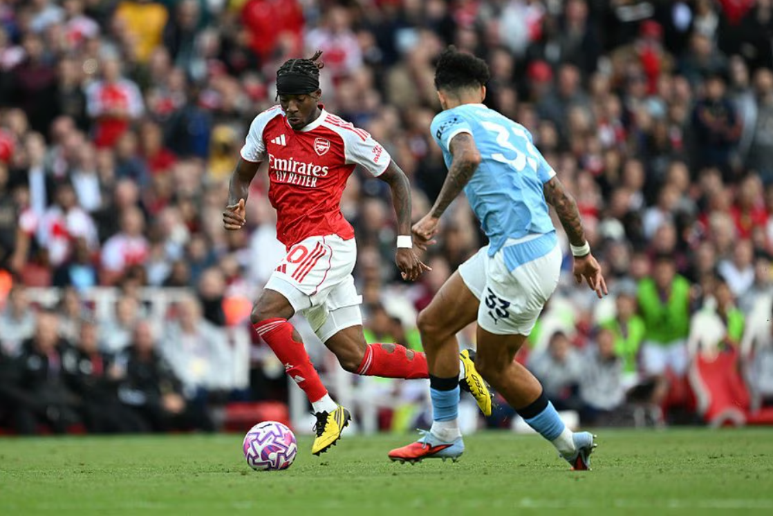 Noni Madueke (red shirt) dribbles during Arsenal's 1-1 draw with Man City in the fifth round of the Premier League at Emirates Stadium, London, England on 21/9/2025. Photo: Arsenal FC