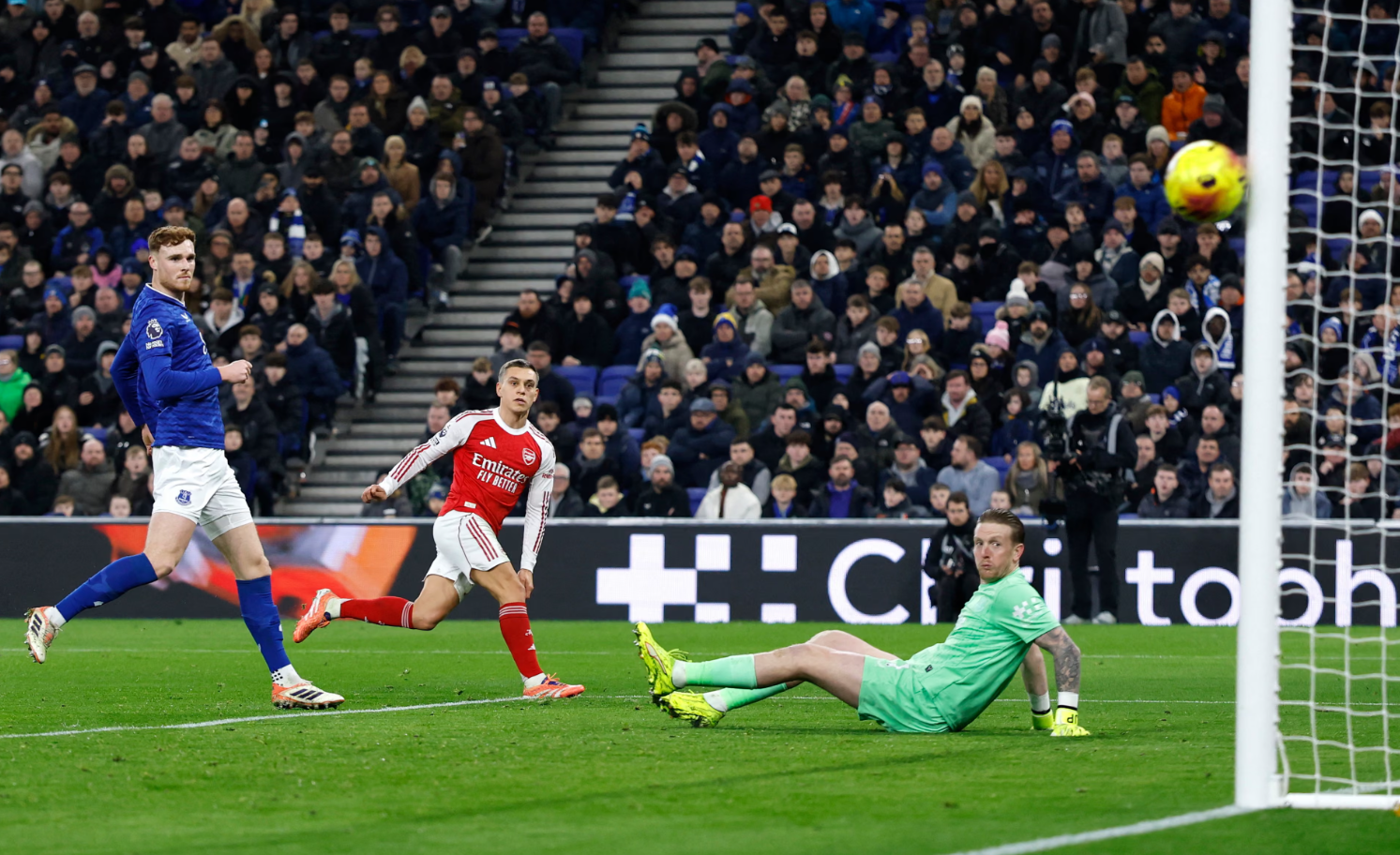 In the second half, Arsenal surprisingly increased the tempo. In the 49th minute, Bukayo Saka combined effectively with Jurrien Timber on the right flank before taking a shot from a tight angle. The ball got past Pickford but James Tarkowski made a desperate block right on the goal line.