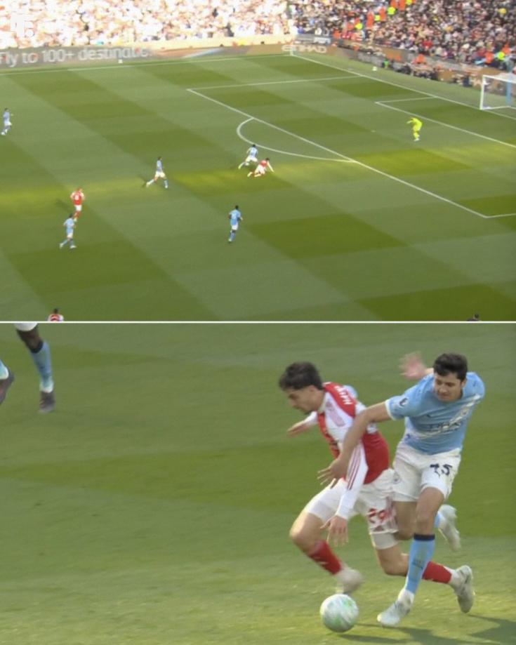 The collision between Kai Havertz (number 29) and Abdukodir Khusanov during Arsenal's 1-2 loss to Man City in matchweek 33 of the Premier League at Etihad Stadium, Manchester, England, on 19/4.