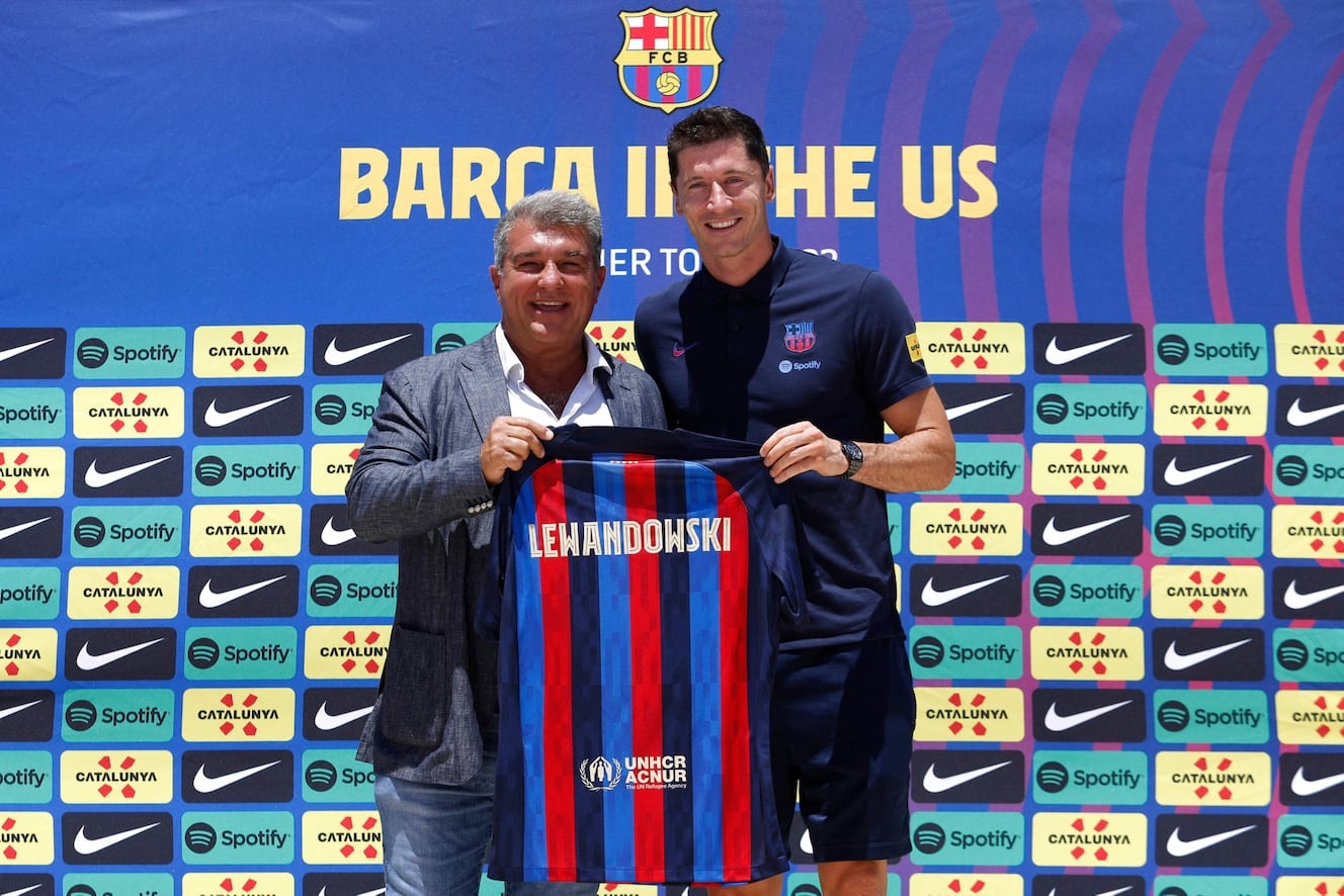 Lewandowski at his Barcelona unveiling ceremony with President Joan Laporta in summer 2022, after his transfer to Barcelona in La Liga. |