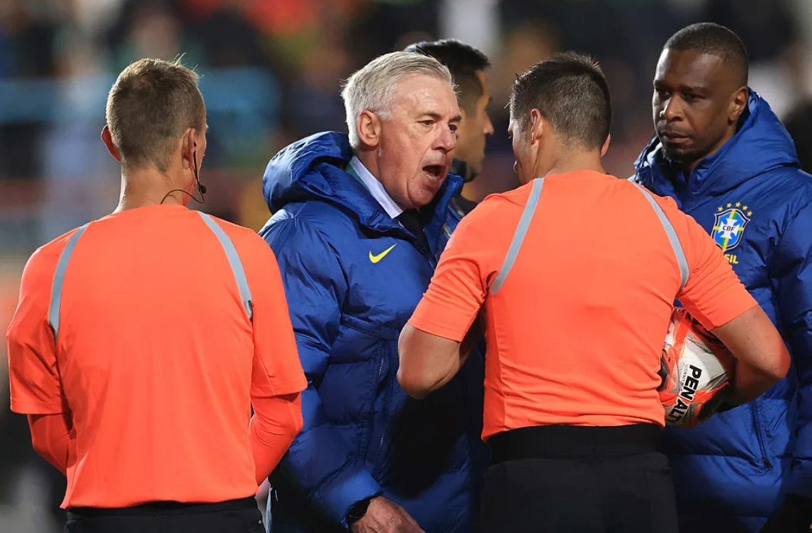 Coach Carlo Ancelotti argues with the referee after Brazil's 1-0 loss to Bolivia in the 2026 World Cup qualifiers. Photo: Yahoo Sports