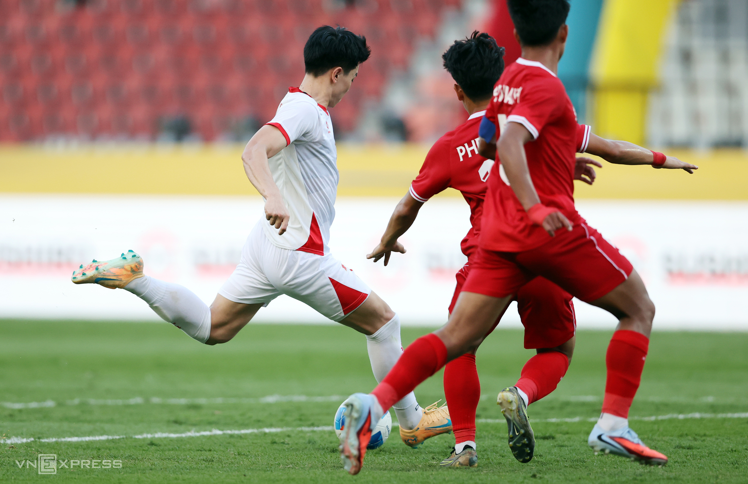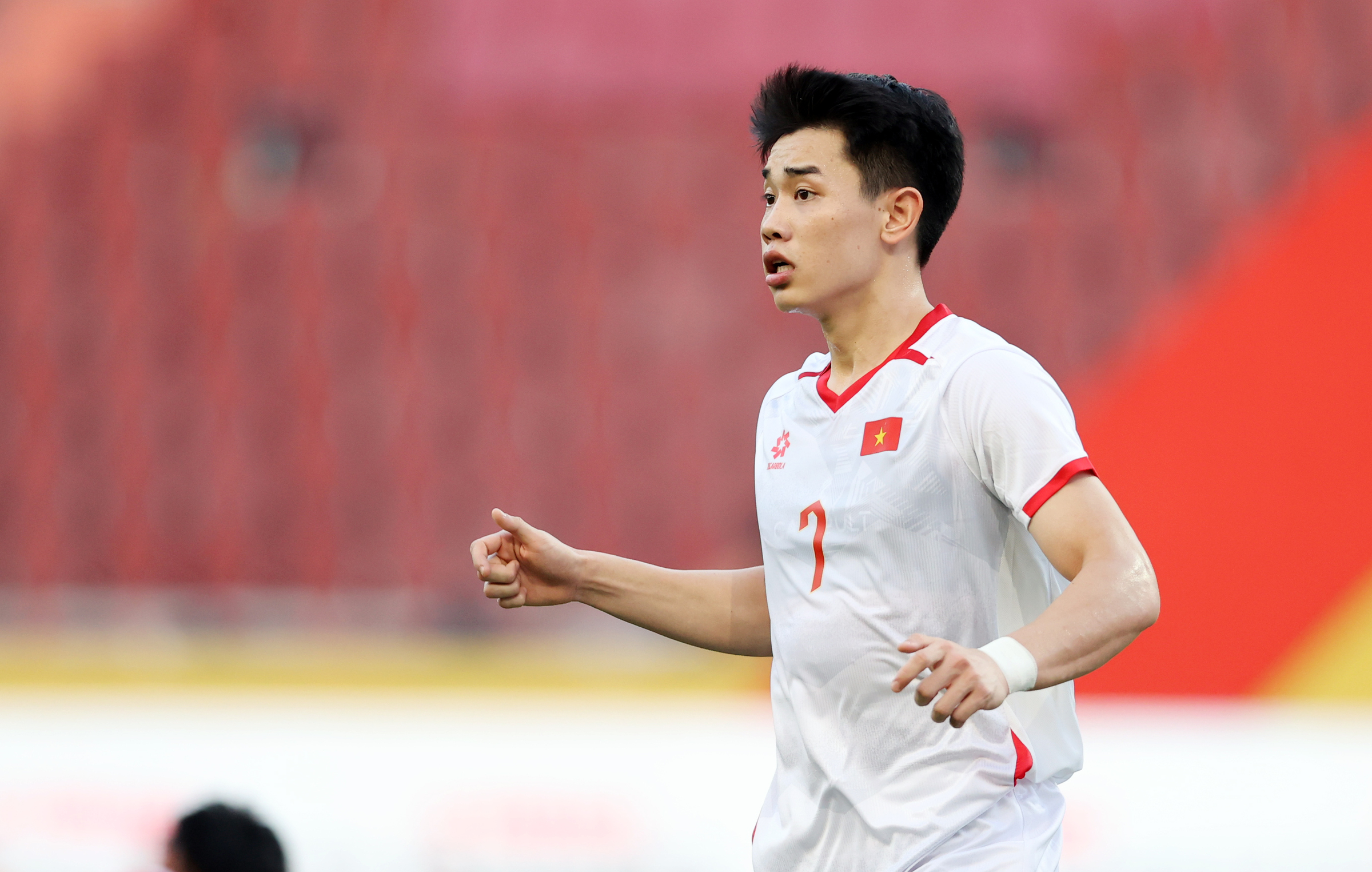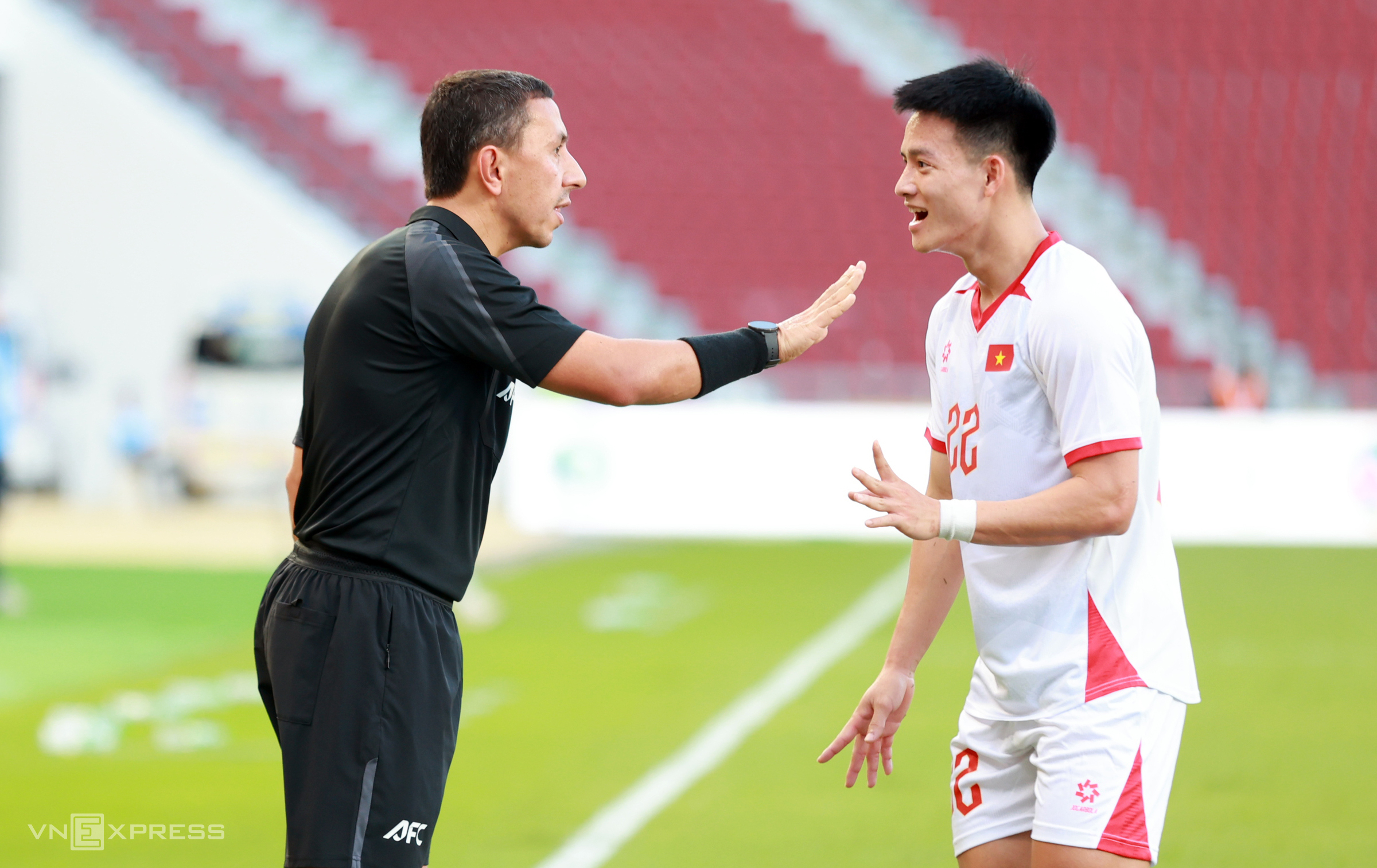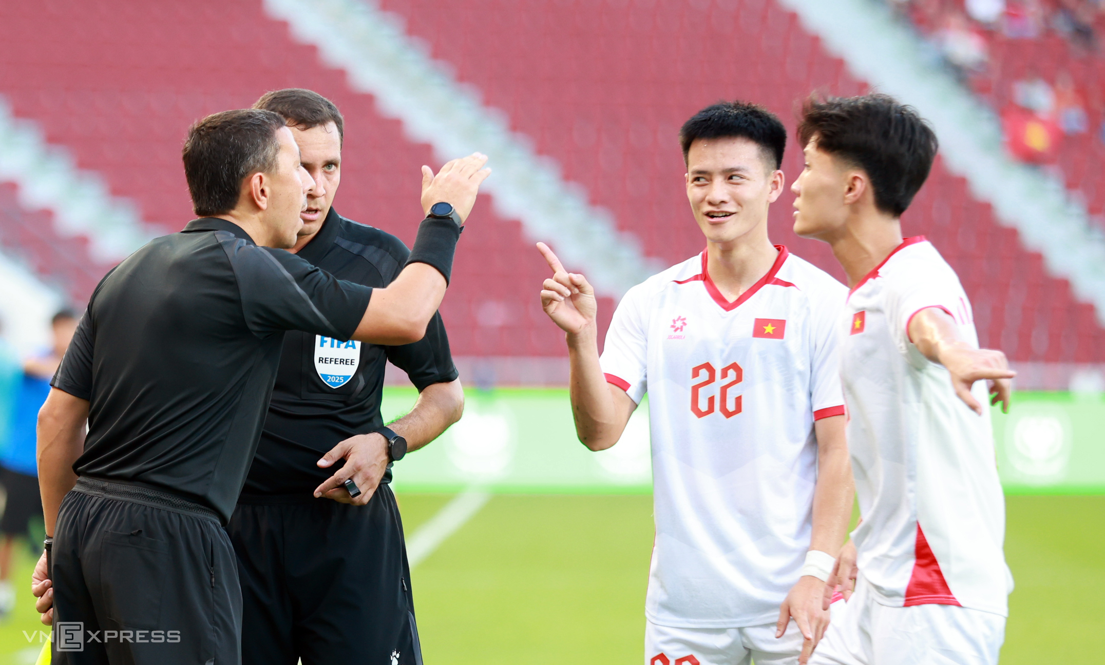 Forward Nguyen Thanh Nhan immediately ran towards the assistant referee to protest. Assistant referee Shayusupov seemingly penalized Nguyen Quoc Viet as the Vietnam forward was in an offside position, stood in the path of the ball, and potentially obstructed the Laos goalkeeper's view.