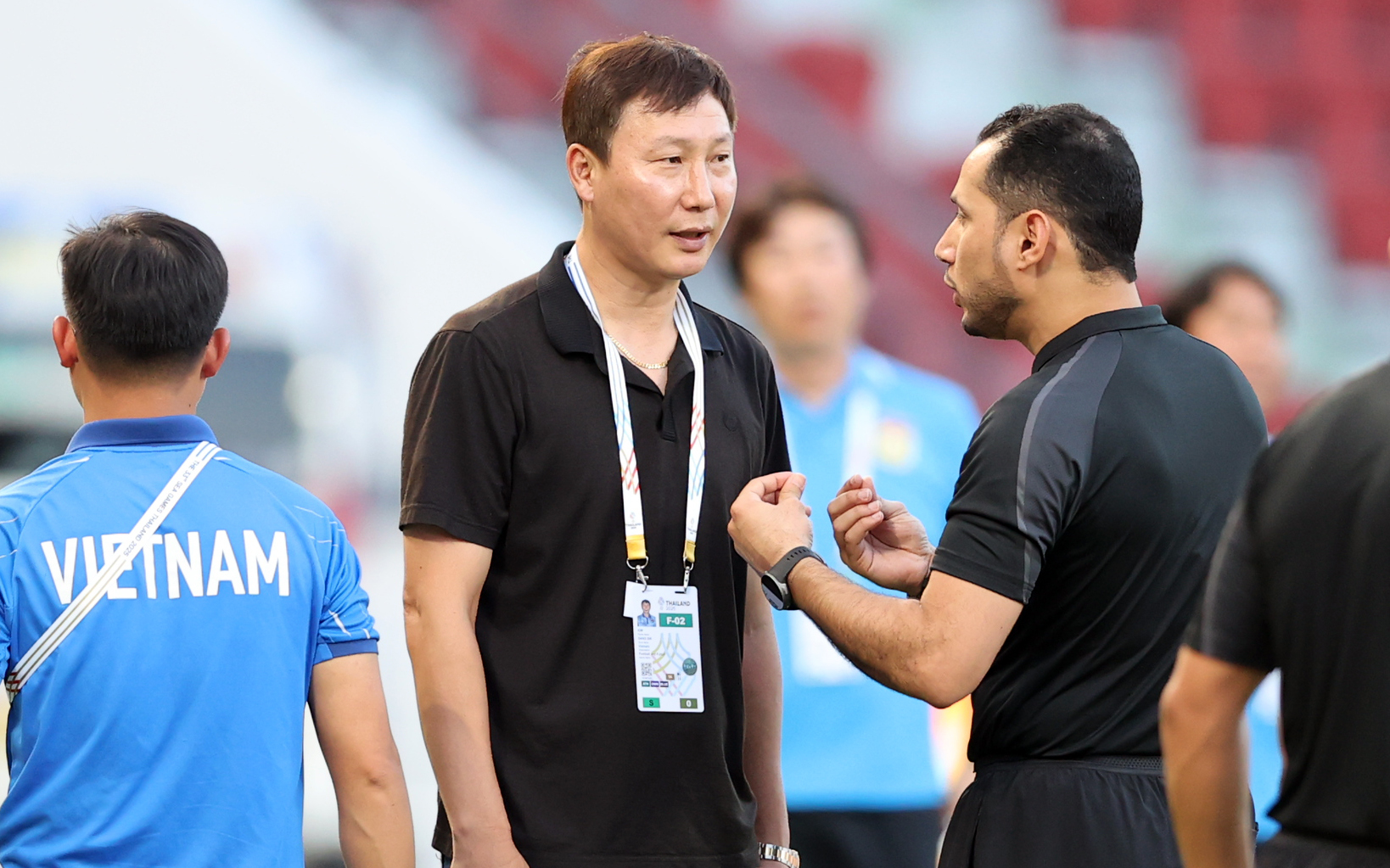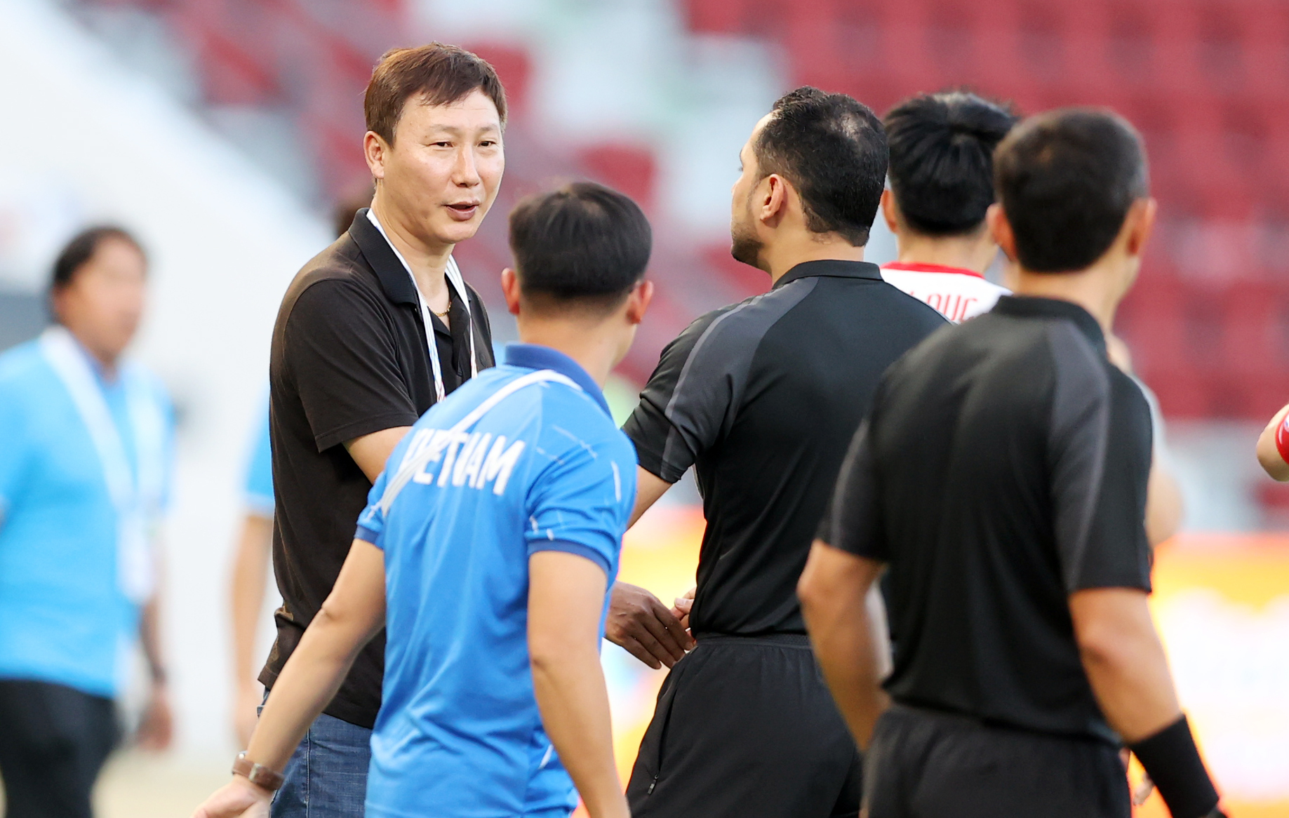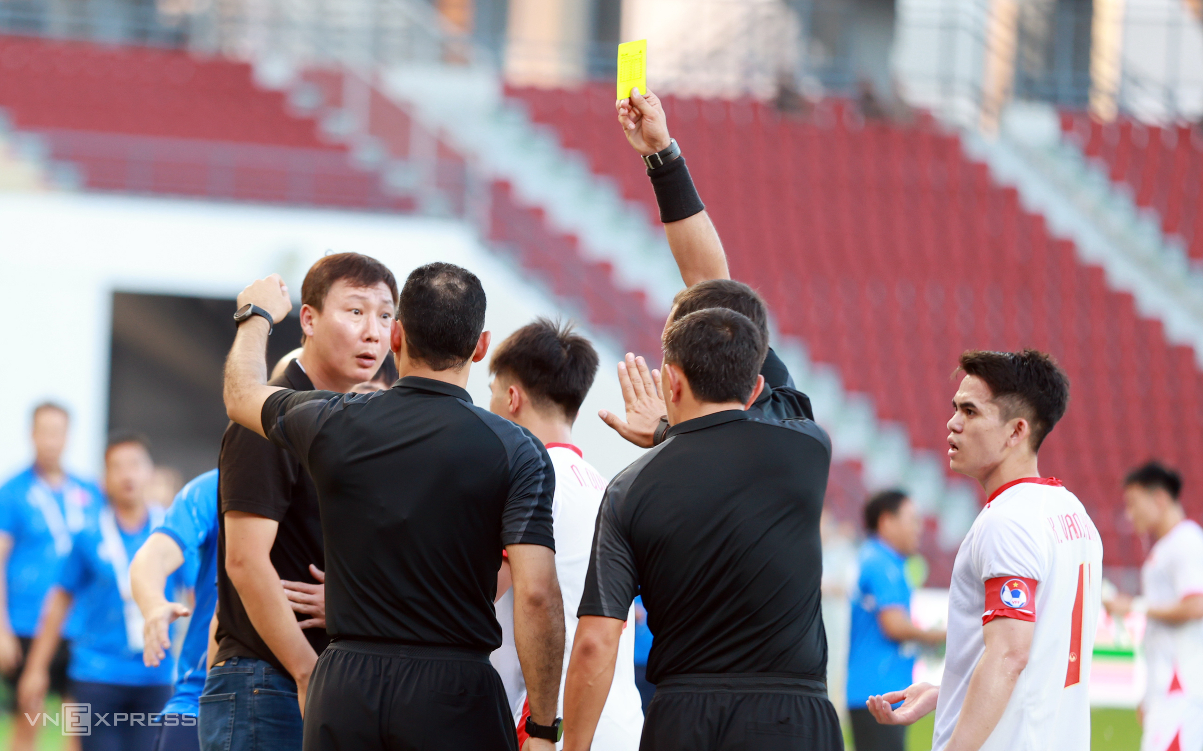Coach Kim Sang-sik initially did not participate in the discussion. But after about one minute, when the goal remained disallowed, he rushed towards the referees, shouting loudly, despite attempts by his assistant and the 4th official to intervene. Coach Kim's fiery behavior resulted in him receiving a yellow card.