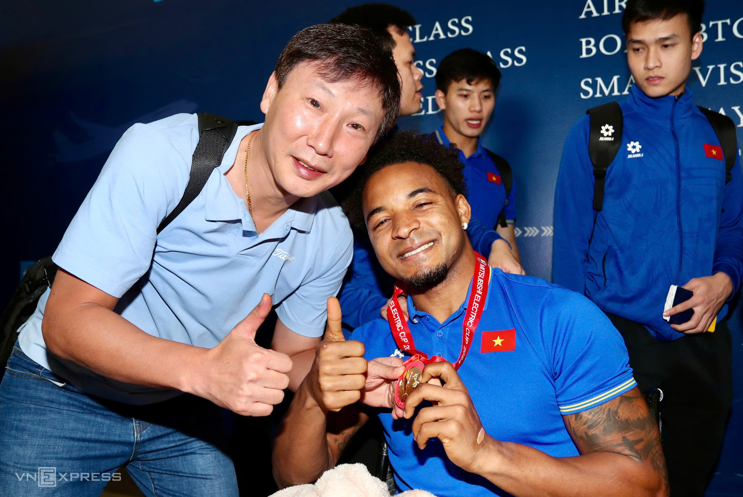 Nguyen Xuan Son (right) and Coach Kim Sang-sik at Suvarnabhumi Airport, Thailand, on 6/1/2025, traveling back to Vietnam after winning the 2024 ASEAN Cup. Photo: Duc Dong. |