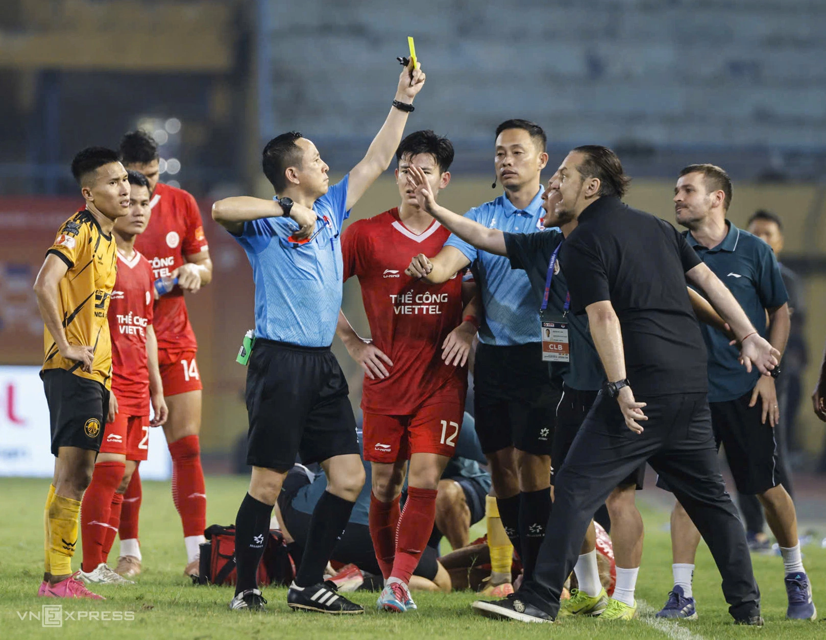 In the 5th minute of second-half stoppage time at Hang Day Stadium, Thanh Hoa defender Truong Thanh Nam made a strong tackle on Wesley Nata near The Cong's technical area. Referee Nguyen Viet Duan issued a yellow card, but home team members believed it should have been a red card.