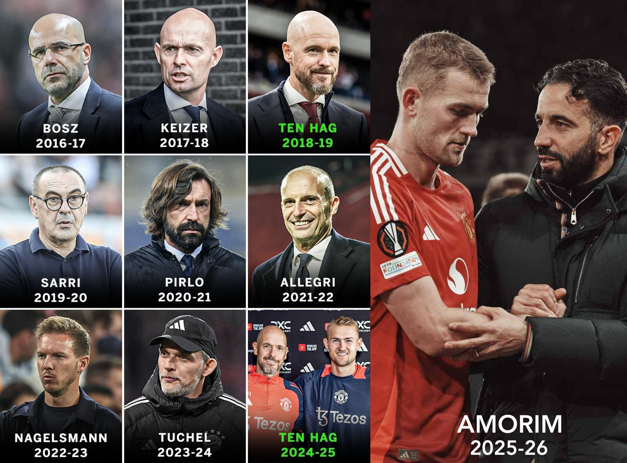 In summer 2024, De Ligt moved to Man Utd for 53 million USD, reuniting with coach Ten Hag. However, by October 2024, Ten Hag was sacked, making way for Ruben Amorim.