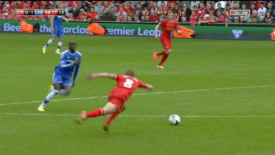 Gerrard (number 8) lost the ball to Demba Ba during Liverpool's 0-2 loss to Chelsea in the 2013-2014 Premier League. Photo: Sky Sports |