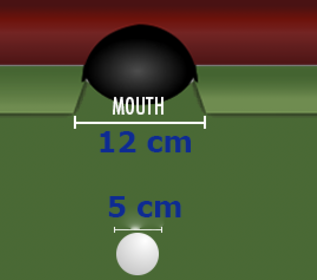 Typical dimensions of a cue ball and the 10-ball pocket. Image: Pooldawg |