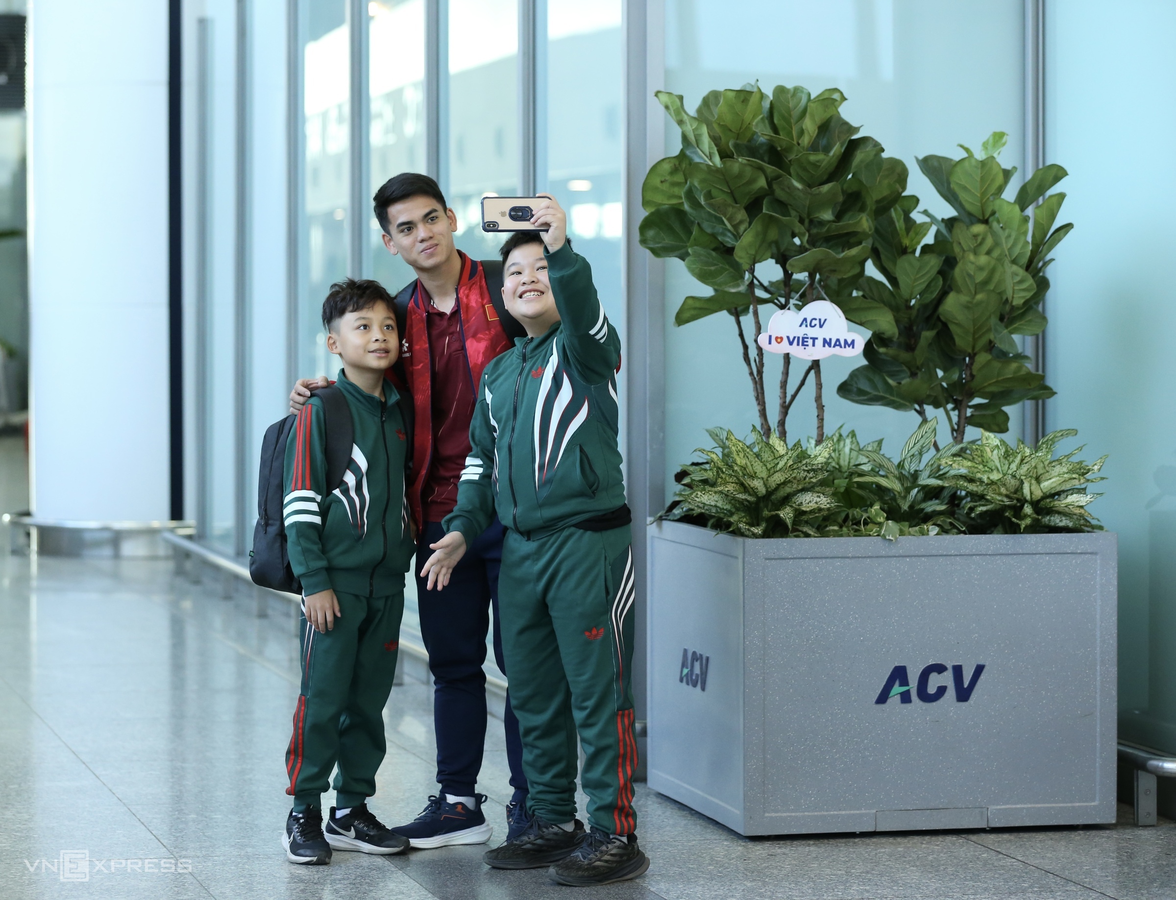 At Noi Bai Airport this morning, Dinh Bac showed no emotion. He wore a cap covering his face for most of the time there, only removing it when fans approached for photos. |