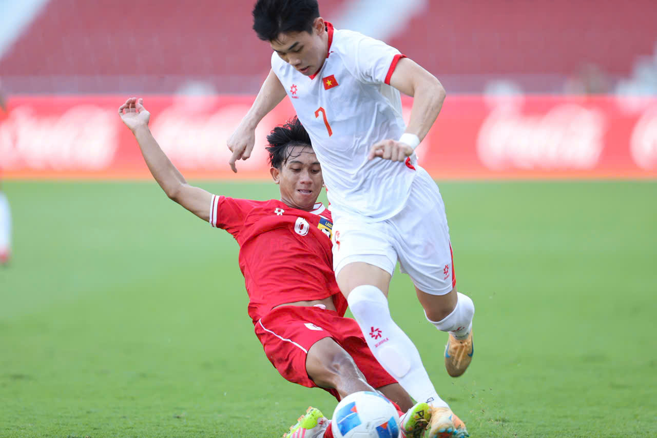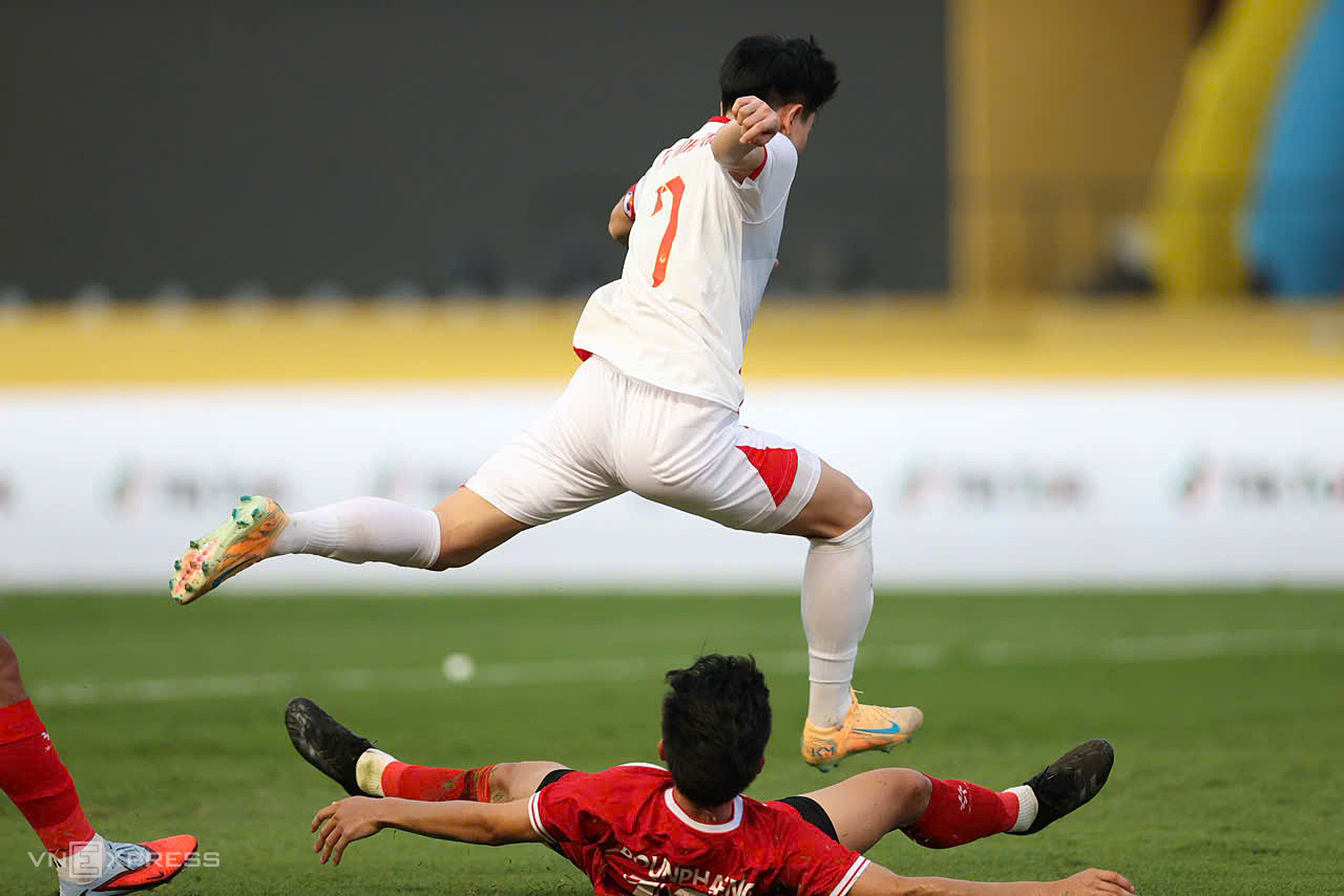 After a brief consultation, main referee Rustam Lutfullin (Uzbekistan) decided to award the goal to Vietnam. He likely determined that striker Quoc Viet's offside position did not affect the Laos goalkeeper's vision. Thanks to this, Dinh Bac celebrated a brace in his SEA Games opening match.