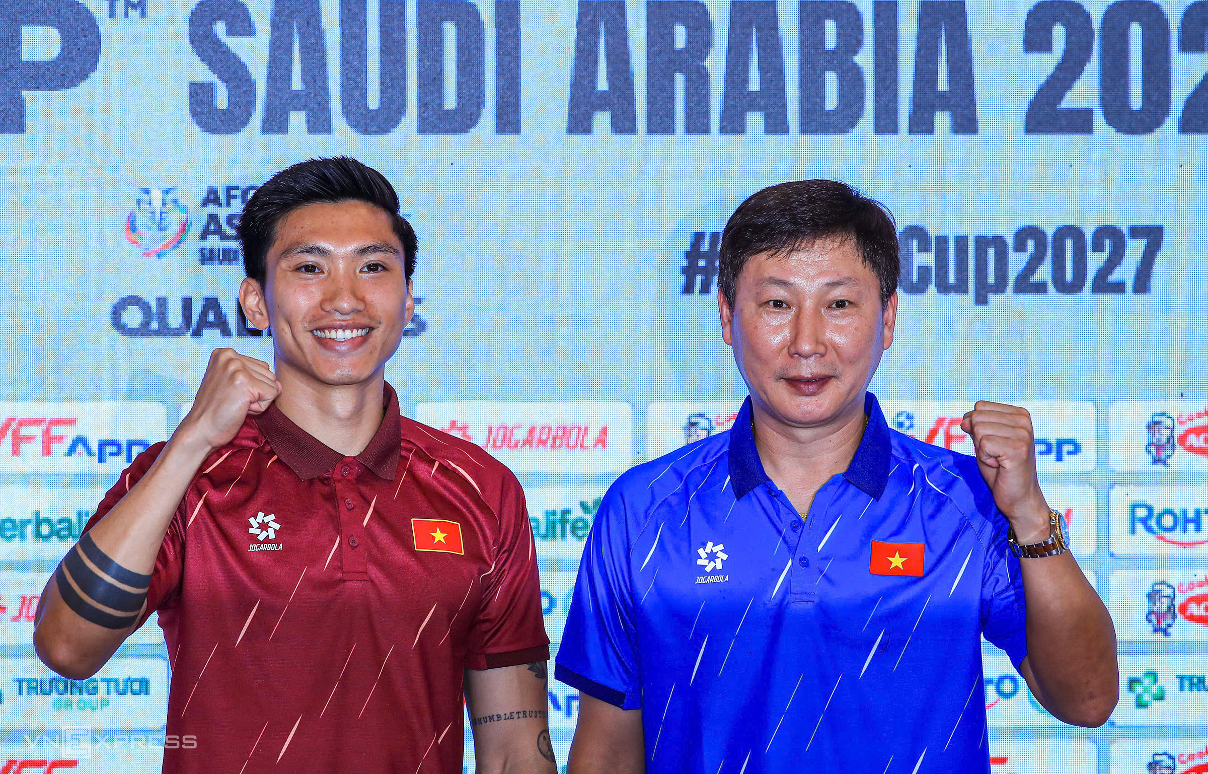 Defender Doan Van Hau and coach Kim Sang-sik at the press conference on the afternoon of 30/3 at Thien Truong stadium, Ninh Binh. *Photo: Hieu Luong* |