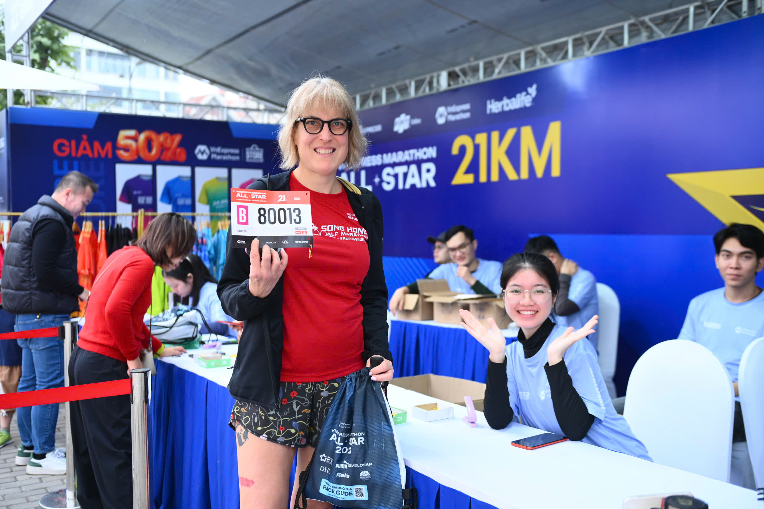 Athlete Le Thi Lai (Anna Le) radiated joy as she received her race-kit with teammates, having traveled from Nha Trang to Hanoi a day early. A familiar face with many successes in the VnExpress Marathon series, she hopes to set a new personal record (PR) for the 21km distance on the Capital's course this time.