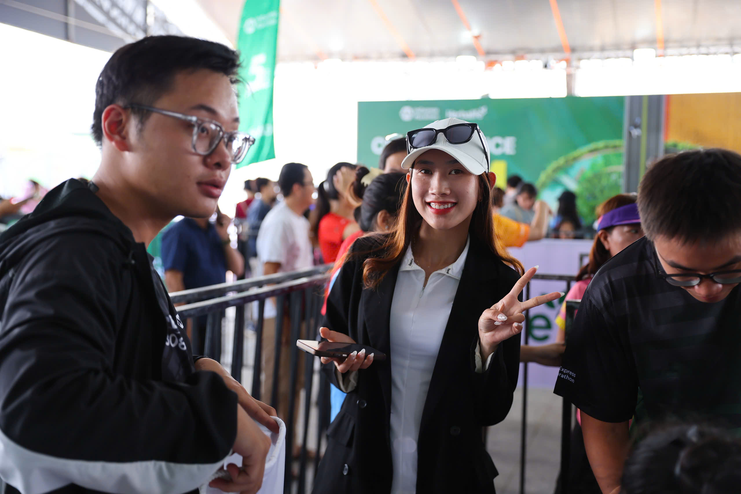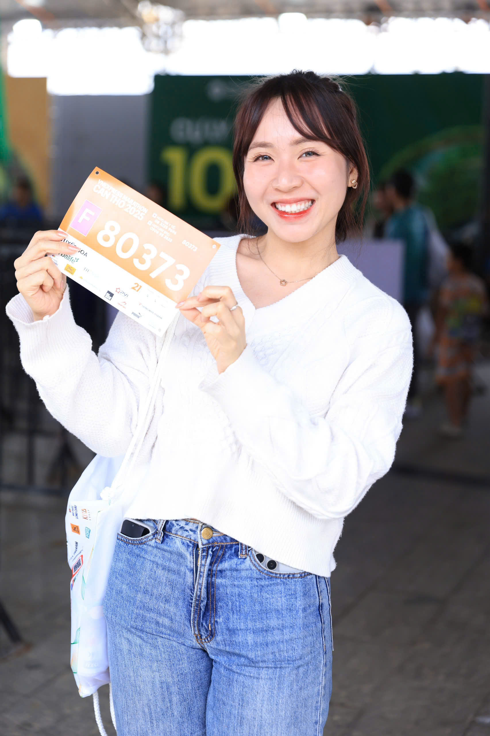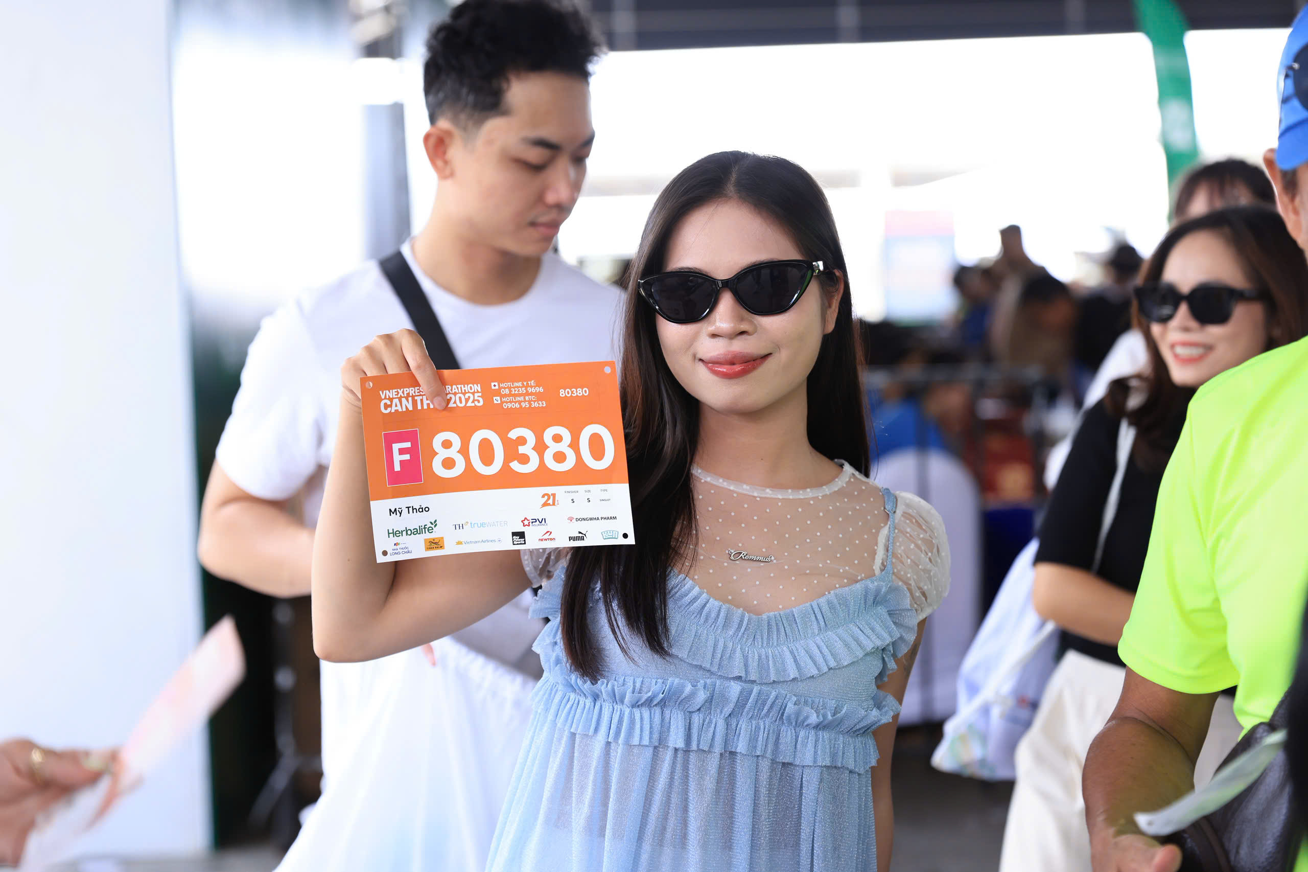 Track and field athlete Nguyen Khanh Ly queued to receive items at the Expo area near Song Hau Park. She participated in the 21km race. (Linh Lam)