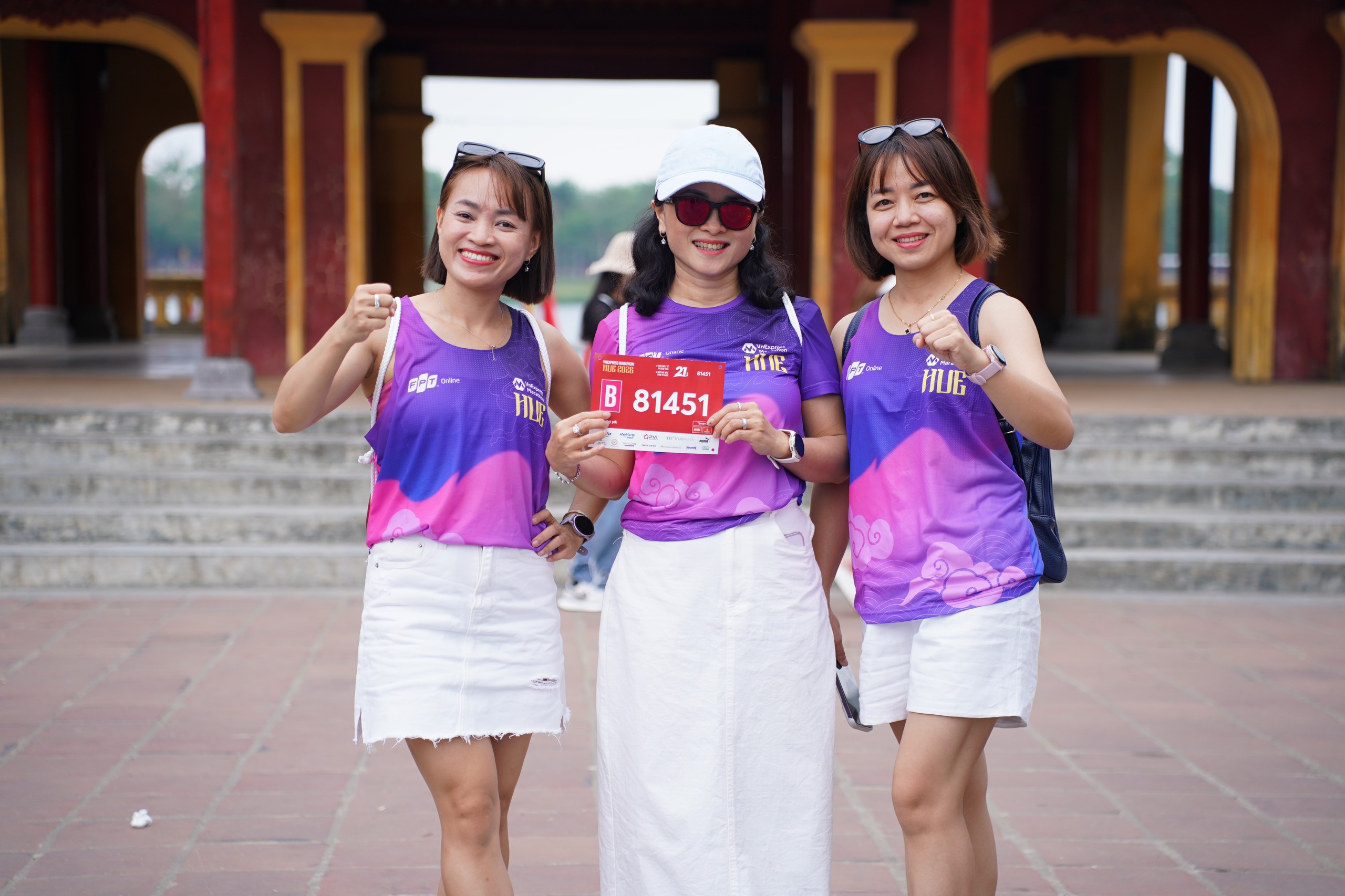 A group of 21km runners posed for a photo in their race shirts, which featured Hue's distinctive purple hue, with Nghenh Luong Dinh in the background.