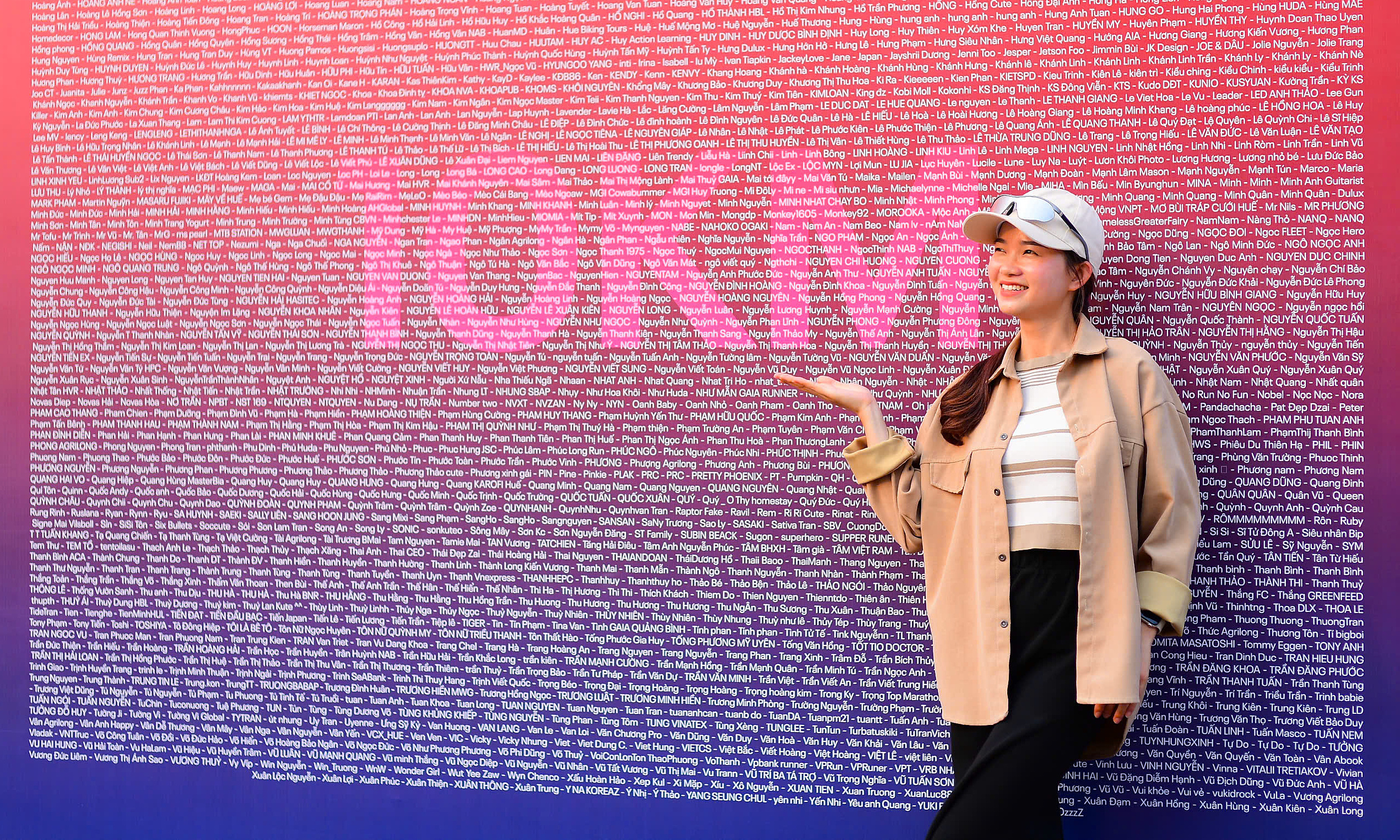 Runner Nga Nguyen posed for a photo with a board displaying the names of the 10km athletes.
