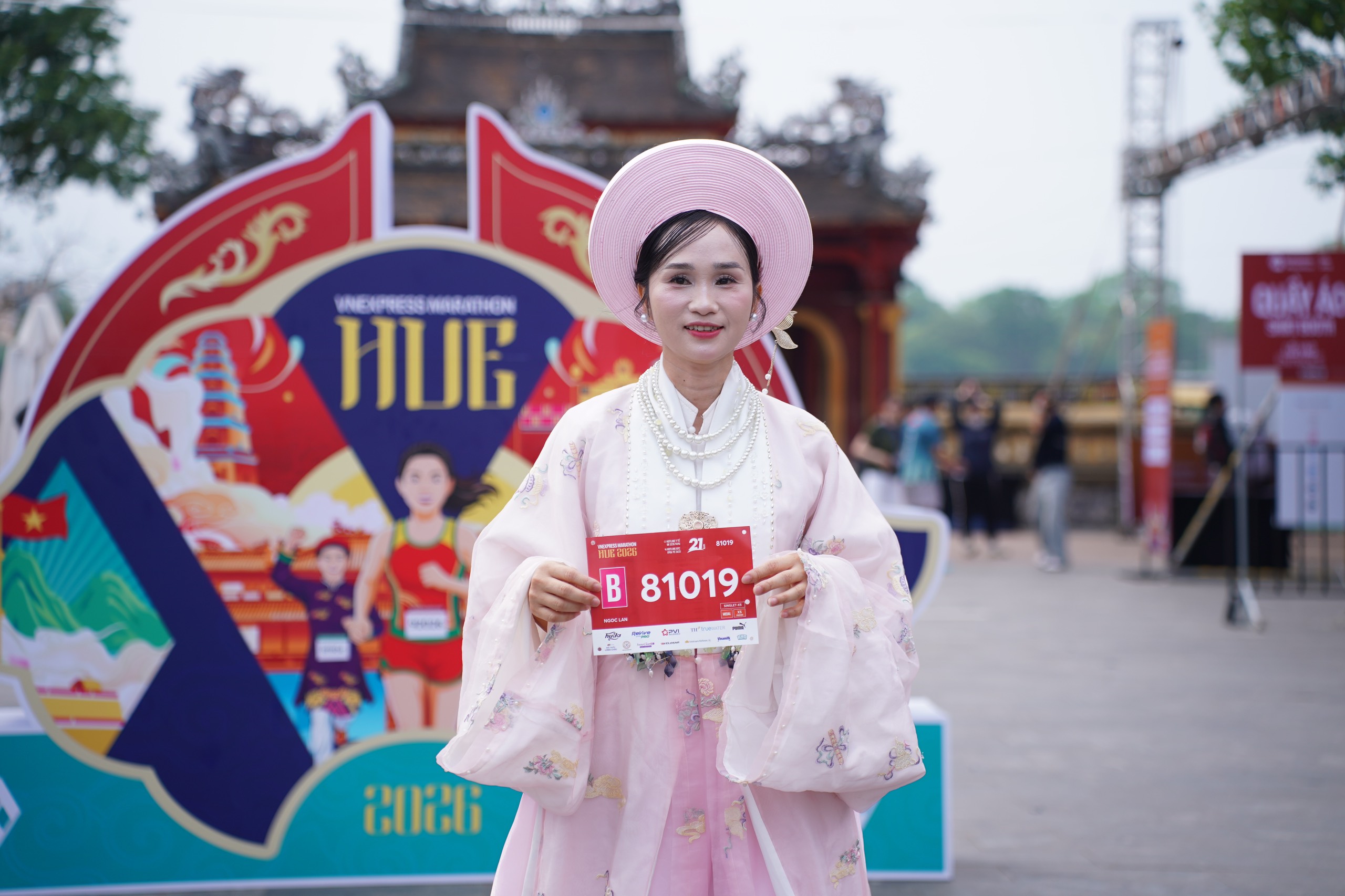 Runner Tran Thi Ngoc was photographed in an ao dai featuring the VnExpress Marathon Hue logo, which is inspired by the 'khanh' – a distinctive decorative motif commonly found on temple doors, mausoleums, and screens within the Nguyen Dynasty heritage sites. Ngoc, who will run the 21km race tomorrow morning, stated that her focus is not on achieving a personal best but on immersing herself in Hue's unique atmosphere.
