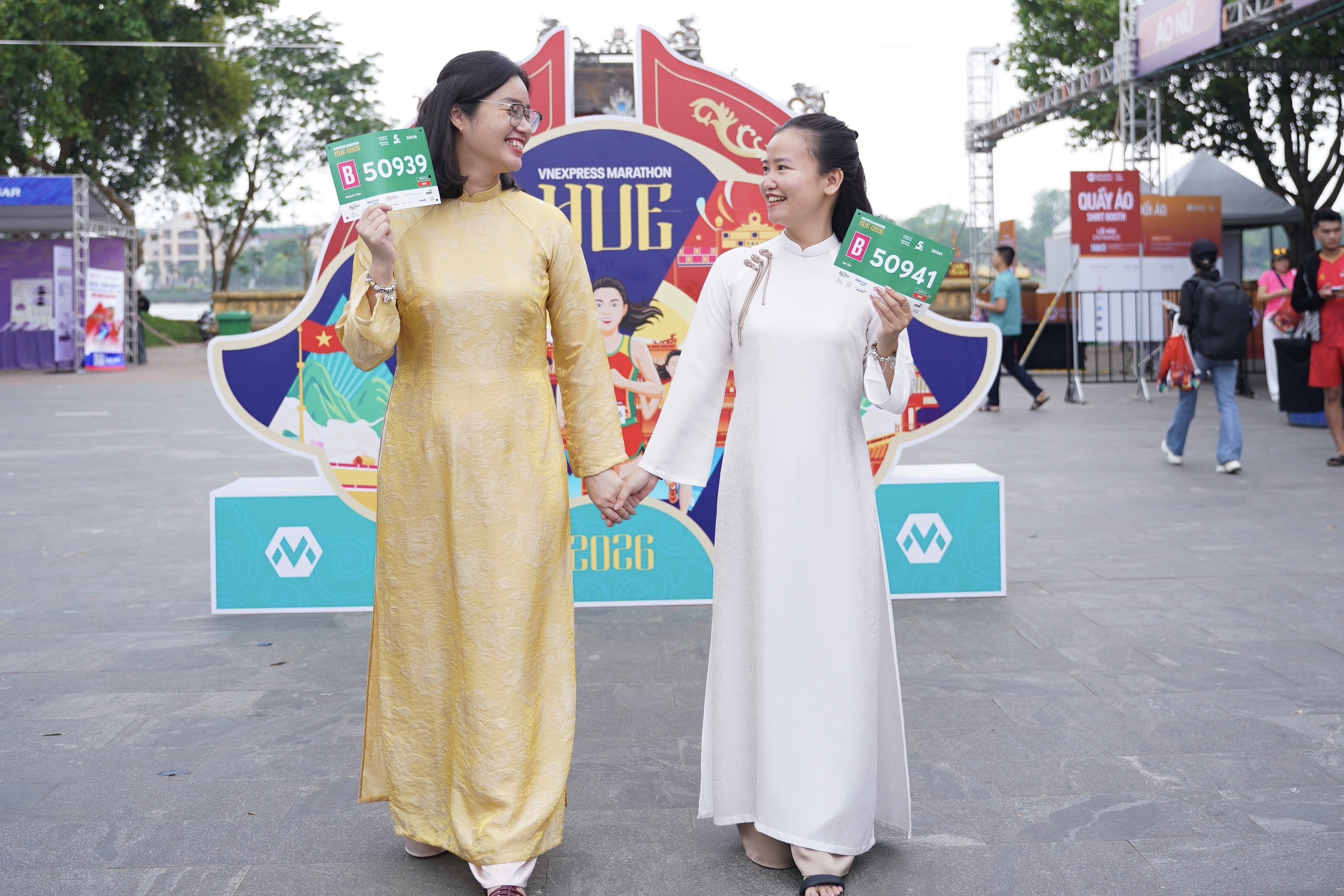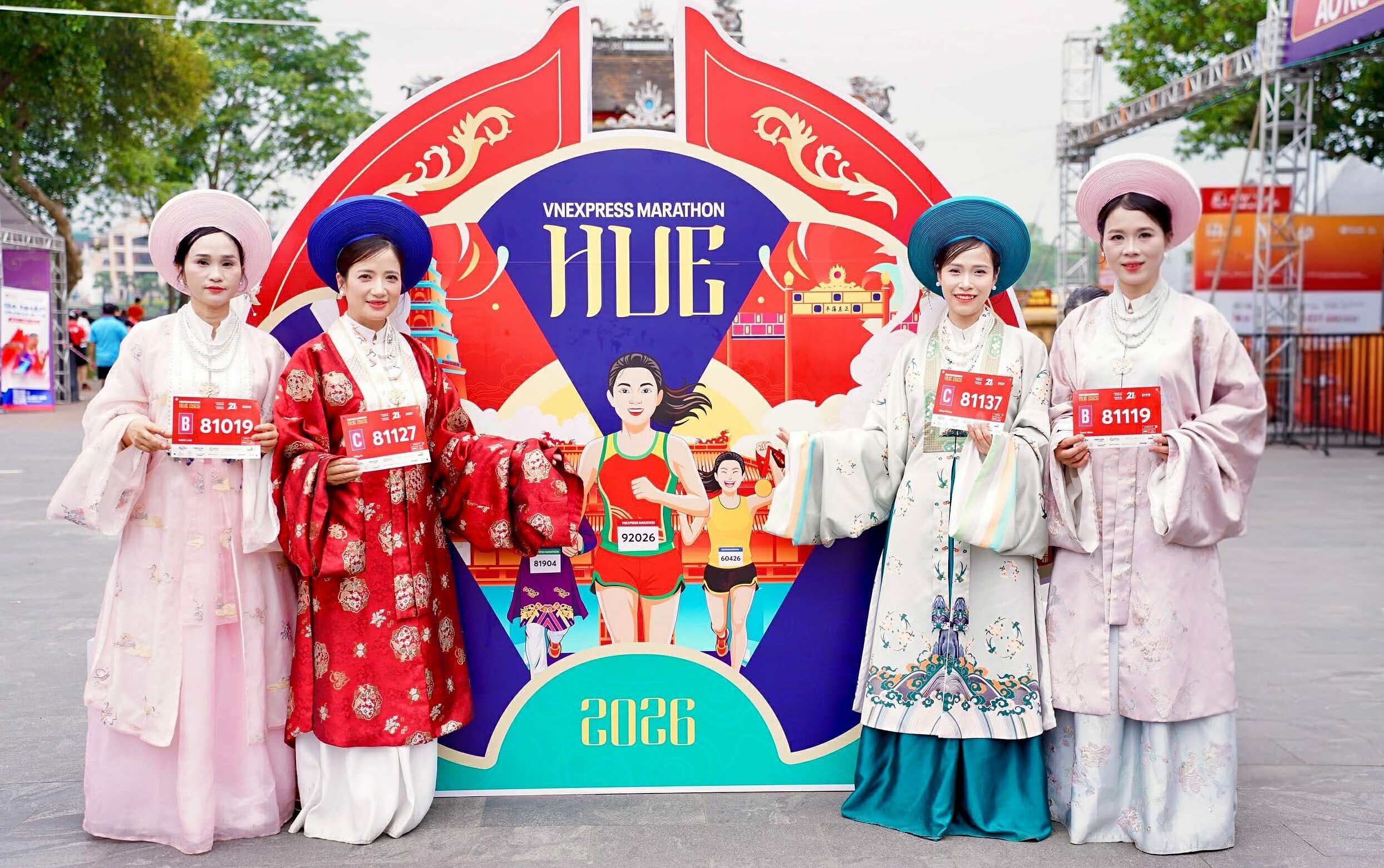 The VnExpress Marathon Hue 2026 bib distribution, held on 17-18/4 at Nghenh Luong Dinh by the Perfume River, was marked by a unique display of cultural appreciation. Instead of sportswear, many female runners chose to wear traditional Vietnamese attire, such as ao dai and co phuc (ancient costumes), when collecting their race bibs. This choice aimed to capture special moments and express their deep affection for Hue, the ancient capital city.