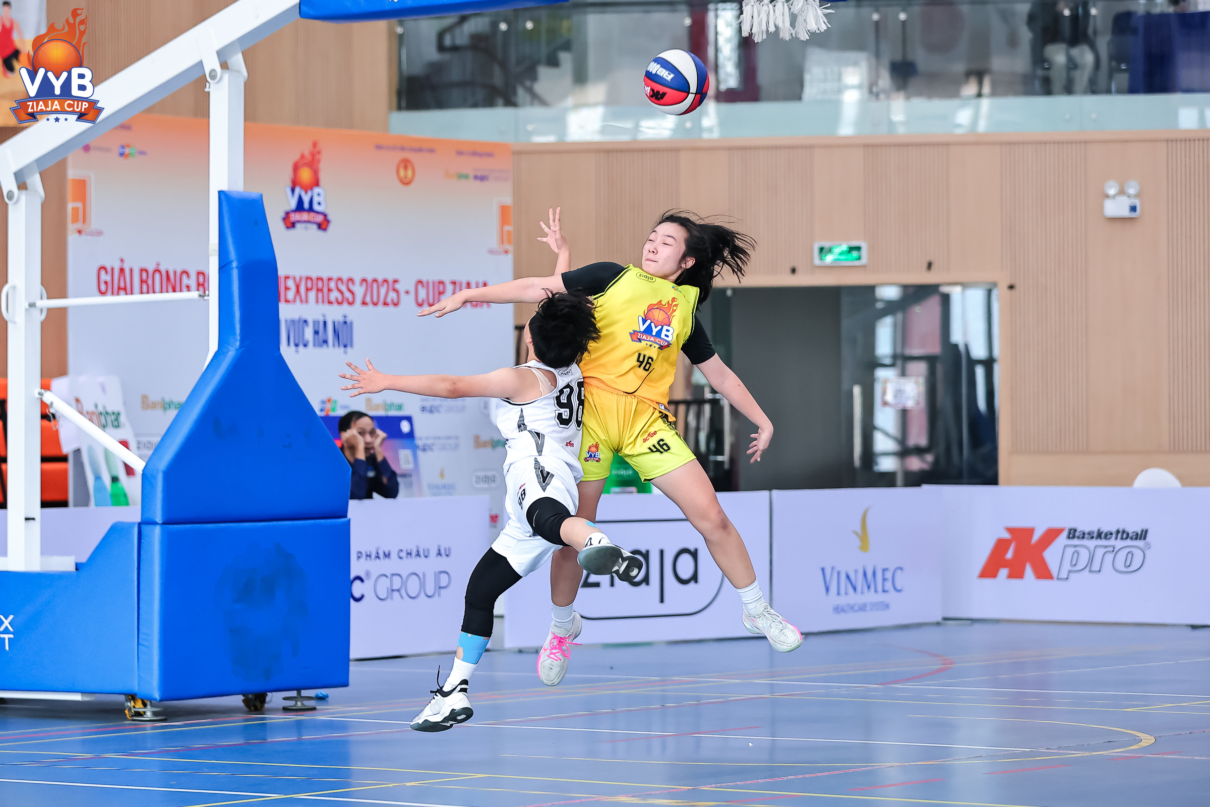 Minh Ha (number 46, yellow) during the Viet Duc vs. Phan Dinh Phung match in the semi-finals of the VnExpress Youth Basketball Tournament, at Hanoi Children's Palace facility 2, on 30/11. Photo: VYB