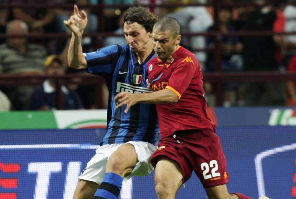 Max Tonetto (right), while playing for Roma, challenges Zlatan Ibrahimovic. Photo: Shutterstock