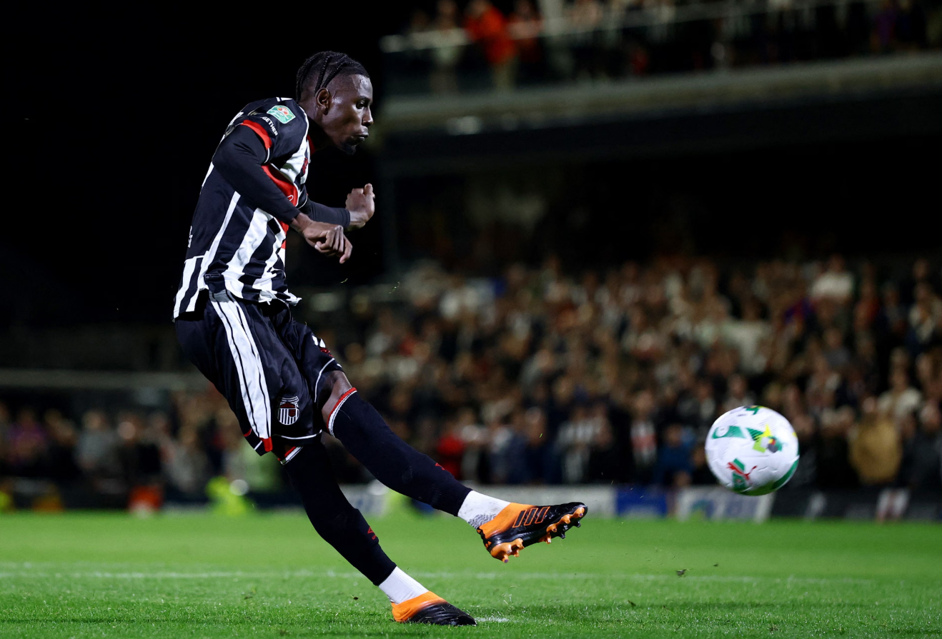 Clarke Oduor misses a penalty as Grimsby Town defeats Manchester United in the Carabao Cup second round at Blundell Park, Cleethorpes, Lincolnshire, UK on the evening of 27/8/2025. Photo: *Reuters* |