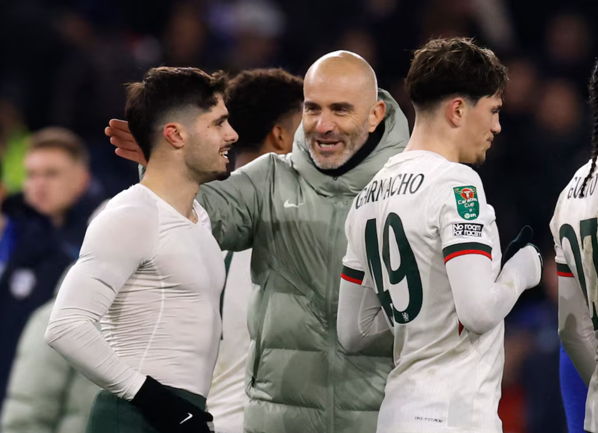 Coach Enzo Maresca celebrates with chelsea players after their 3-1 victory over cardiff city in the league cup quarter-finals on 16/12. *Photo: Reuters*