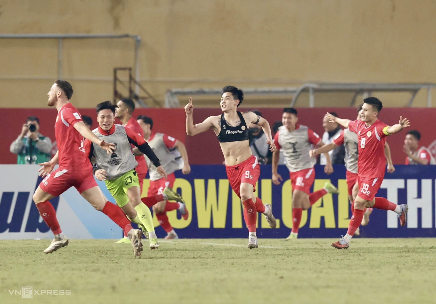Hanoi Police forward Nguyen Dinh Bac (center) celebrates a goal in the 90th minute during their 2-1 victory over Beijing Guoan (China) on the fifth matchday of Group E in the AFC Champions League Two 2025-2026, at Hang Day Stadium, Hanoi on 27/11. Photo: Hoang Huynh