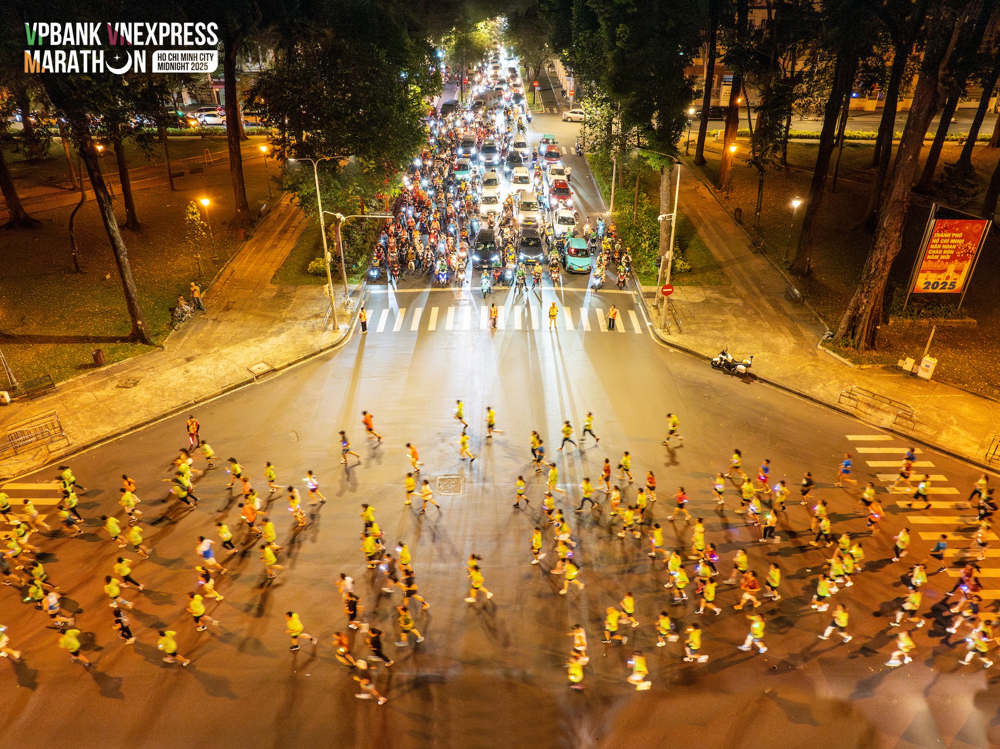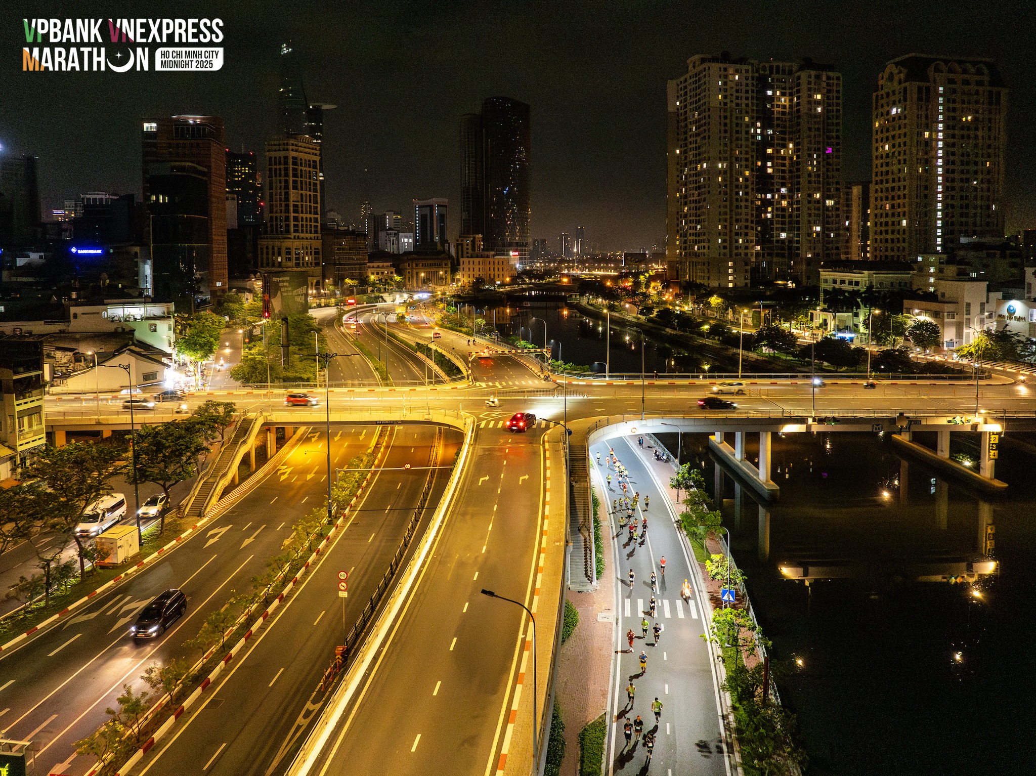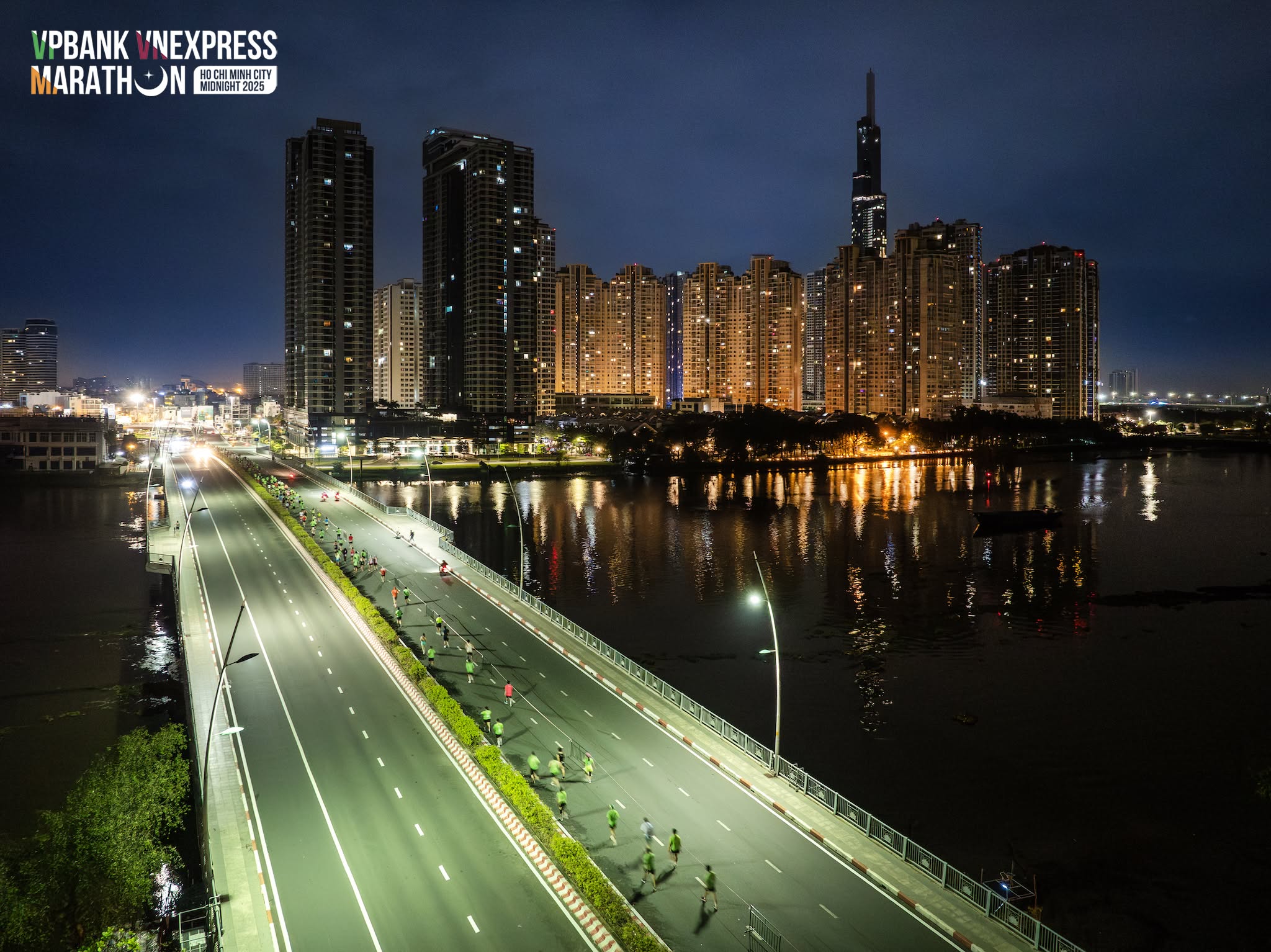 Descending the bridge, runners head towards the Thu Thiem new urban area. To illuminate dimly lit sections, the organizers thoughtfully deployed 200 electric motorbikes last season, providing clear visibility and absolute safety for every step. |