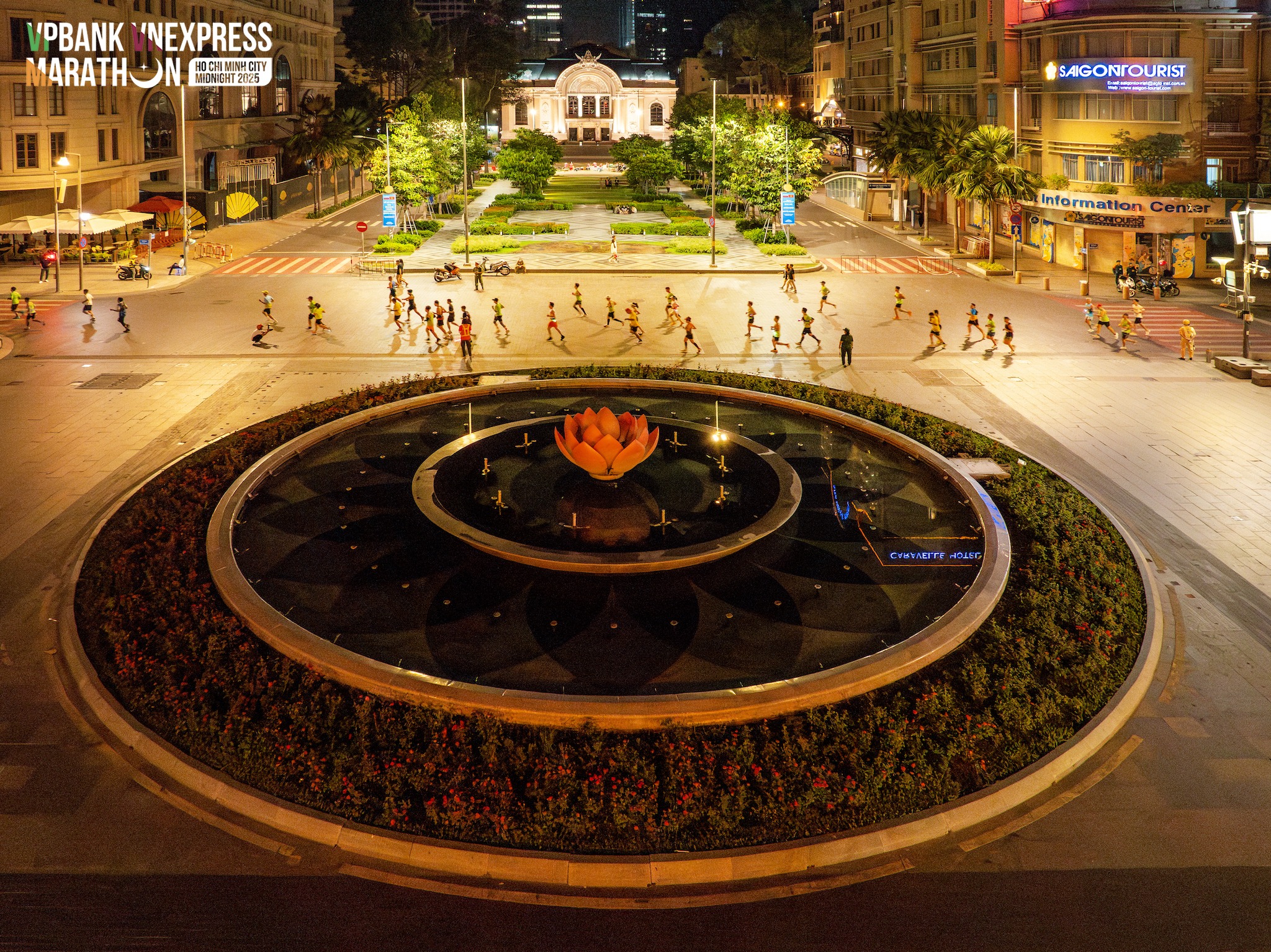 Thousands of runners pass the Headquarters of the Ho Chi Minh City People's Committee, a classical architectural marvel standing out amid the modern urban landscape. |