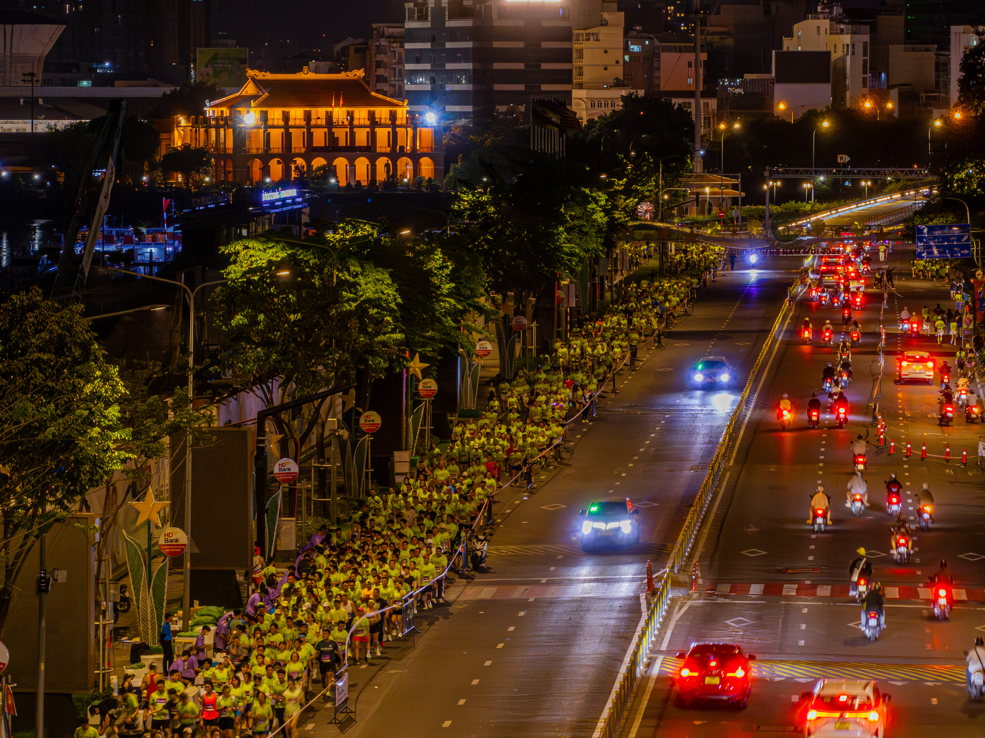 Thousands of runners, forming a neon blue stream, passed by the brightly lit Nha Rong Wharf in the background, creating an impressive scene.