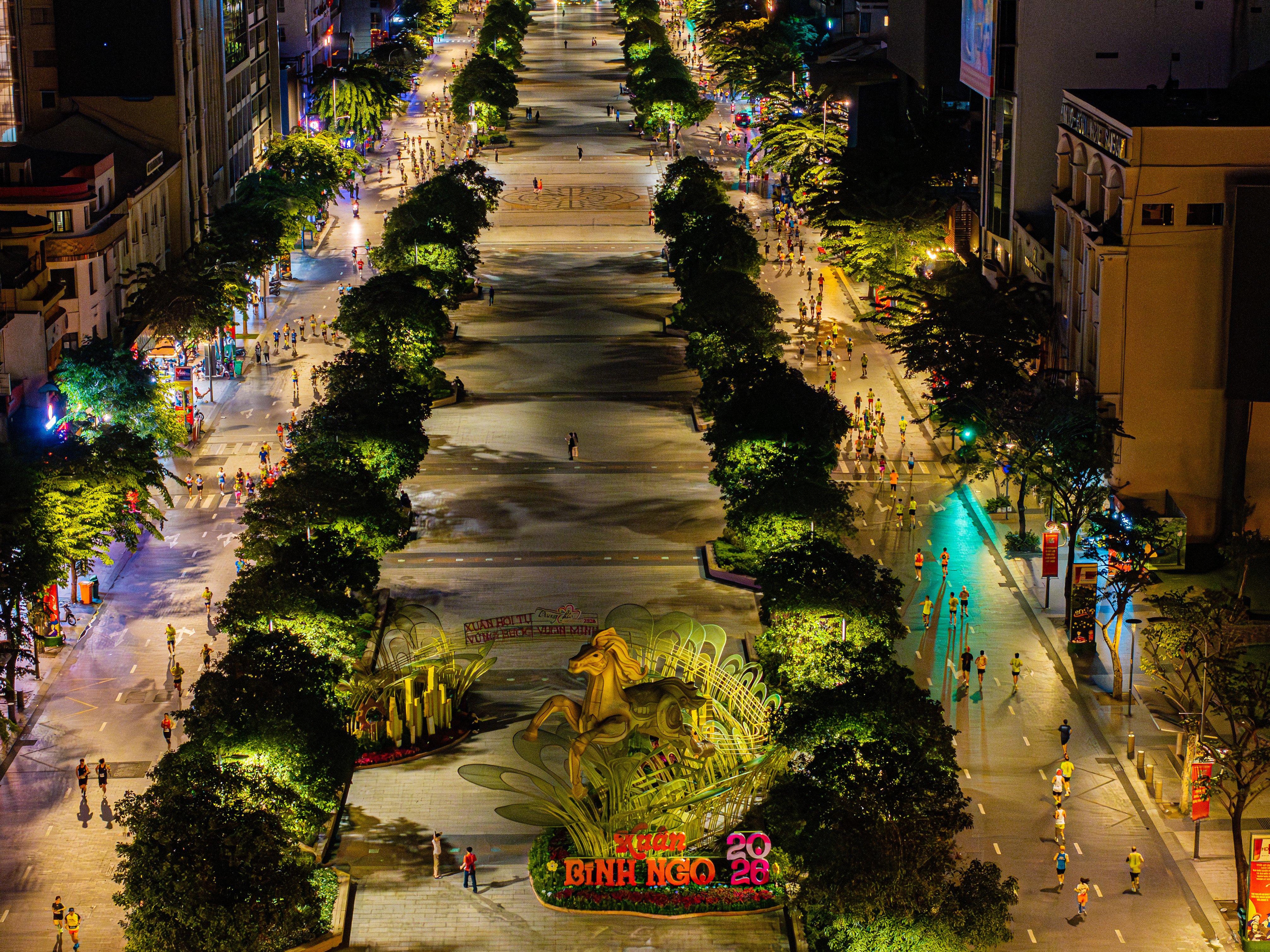 Adjacent to the People's Committee building is Nguyen Hue Walking Street. Many foreign tourists stopped to high-five and cheer as athletes ran past this section of the road.