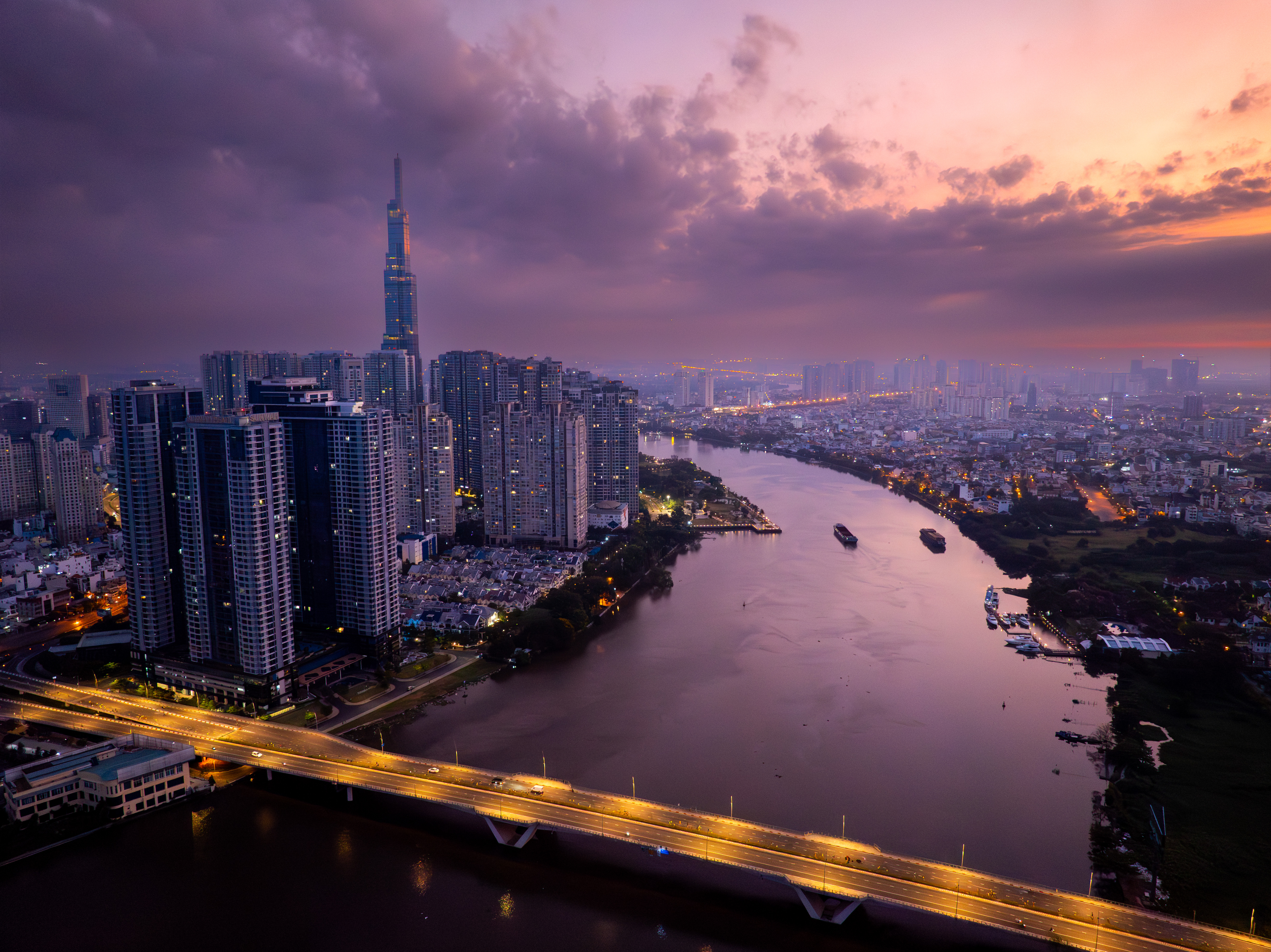 In addition to Ba Son Bridge, the 21km and 42km night race routes also crossed two other bridges: Thoi Dai Bridge and Thu Thiem Bridge. The photo shows a section of Thu Thiem Bridge viewed from above.