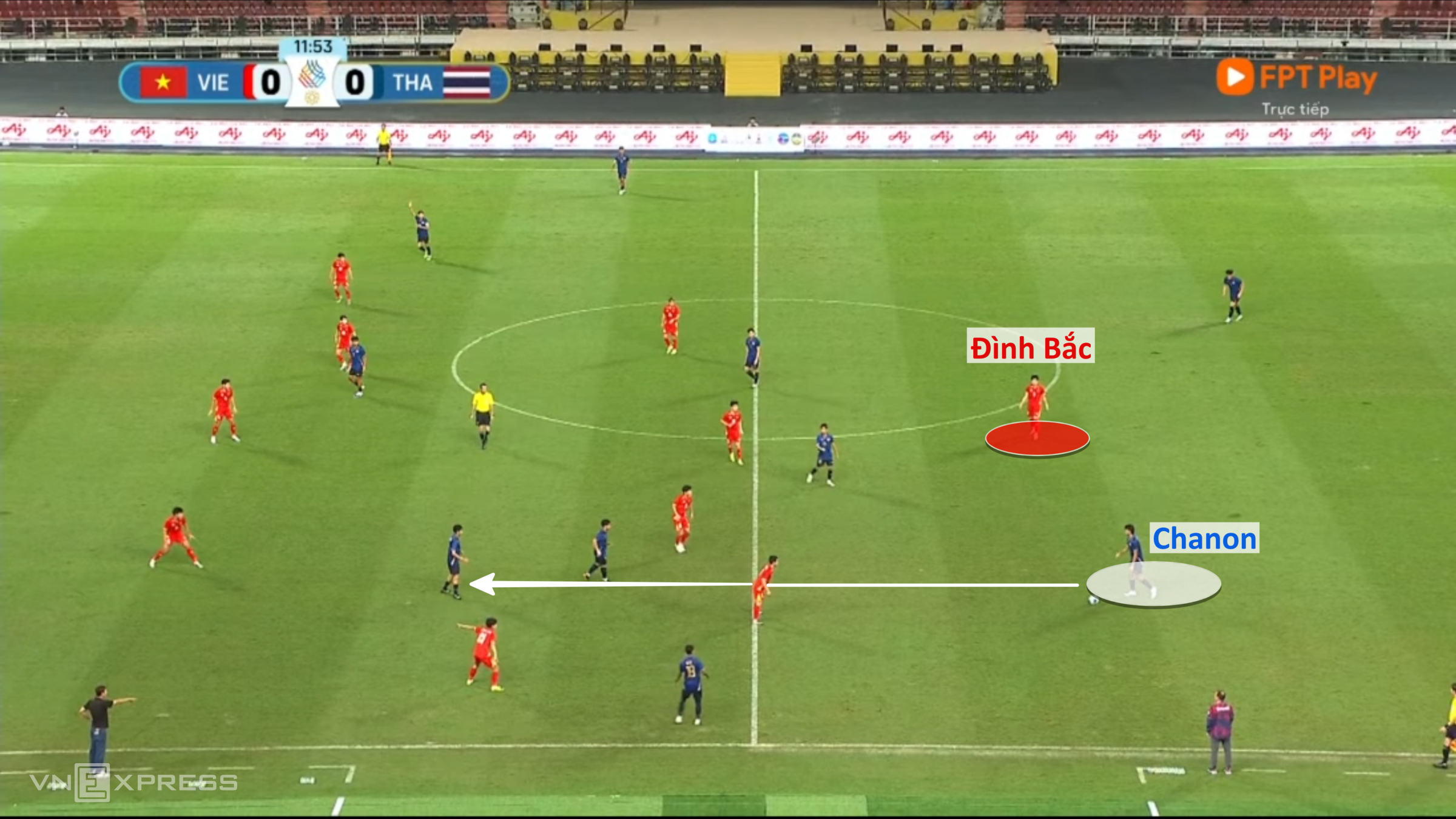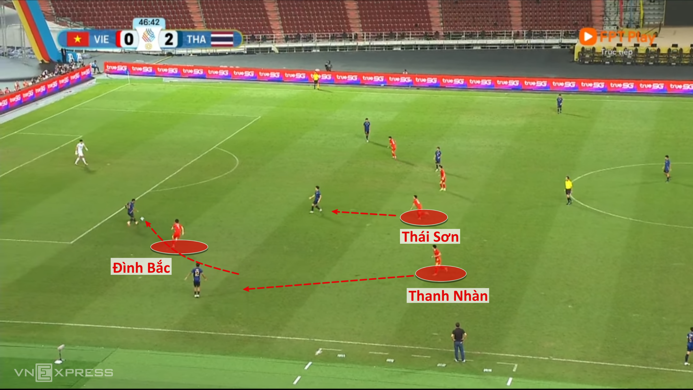 Vietnam's formation shifted higher, from a mid-to-high block. With fresh legs, the red-shirted squad injected new energy into their front-line pressing. Compared to the first half, Dinh Bac, while still maintaining the highest position in attack when out of possession, began making continuous arc-shaped runs from outside to inside to pressure Thailand's defenders as they tried to build play from the back.
