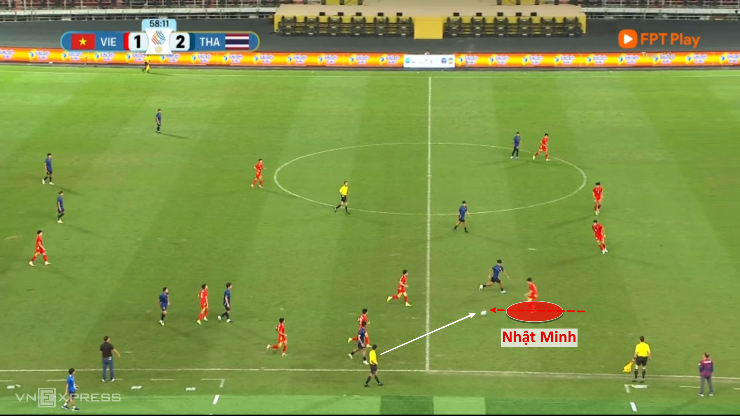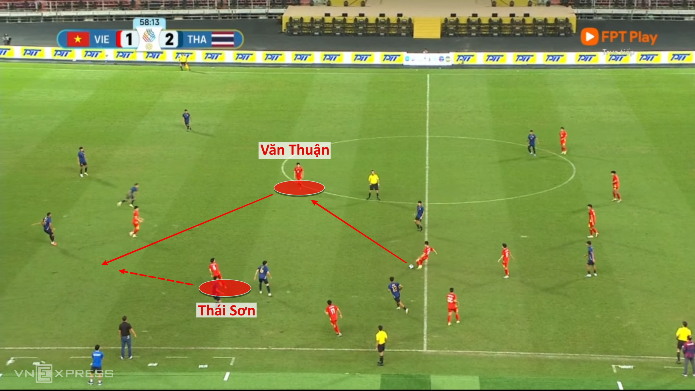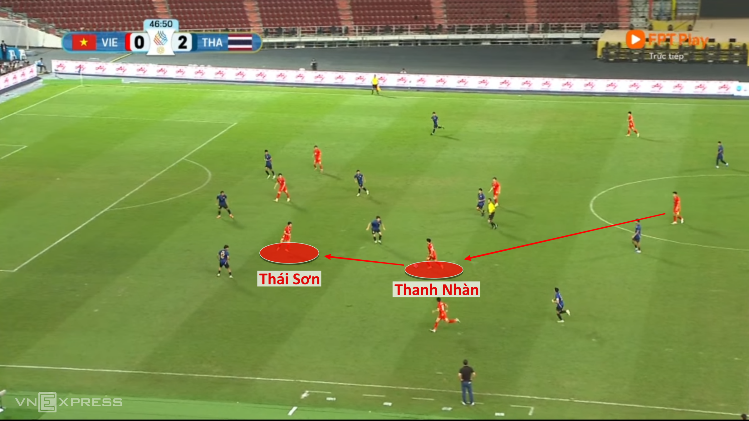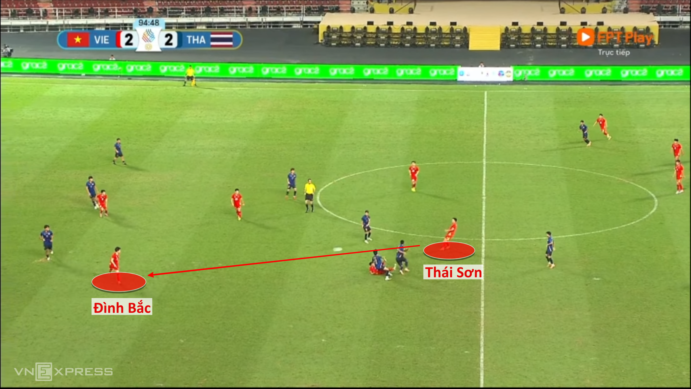 Vietnam quickly recovered the second ball in the opponent's half through Thanh Nhan, immediately transitioning to attack. As a result, Thai Son delivered a through ball, allowing Dinh Bac to break free behind Thailand's unsettled defense. This led to a penalty, from which number 7 scored to reduce the deficit to 1-2.