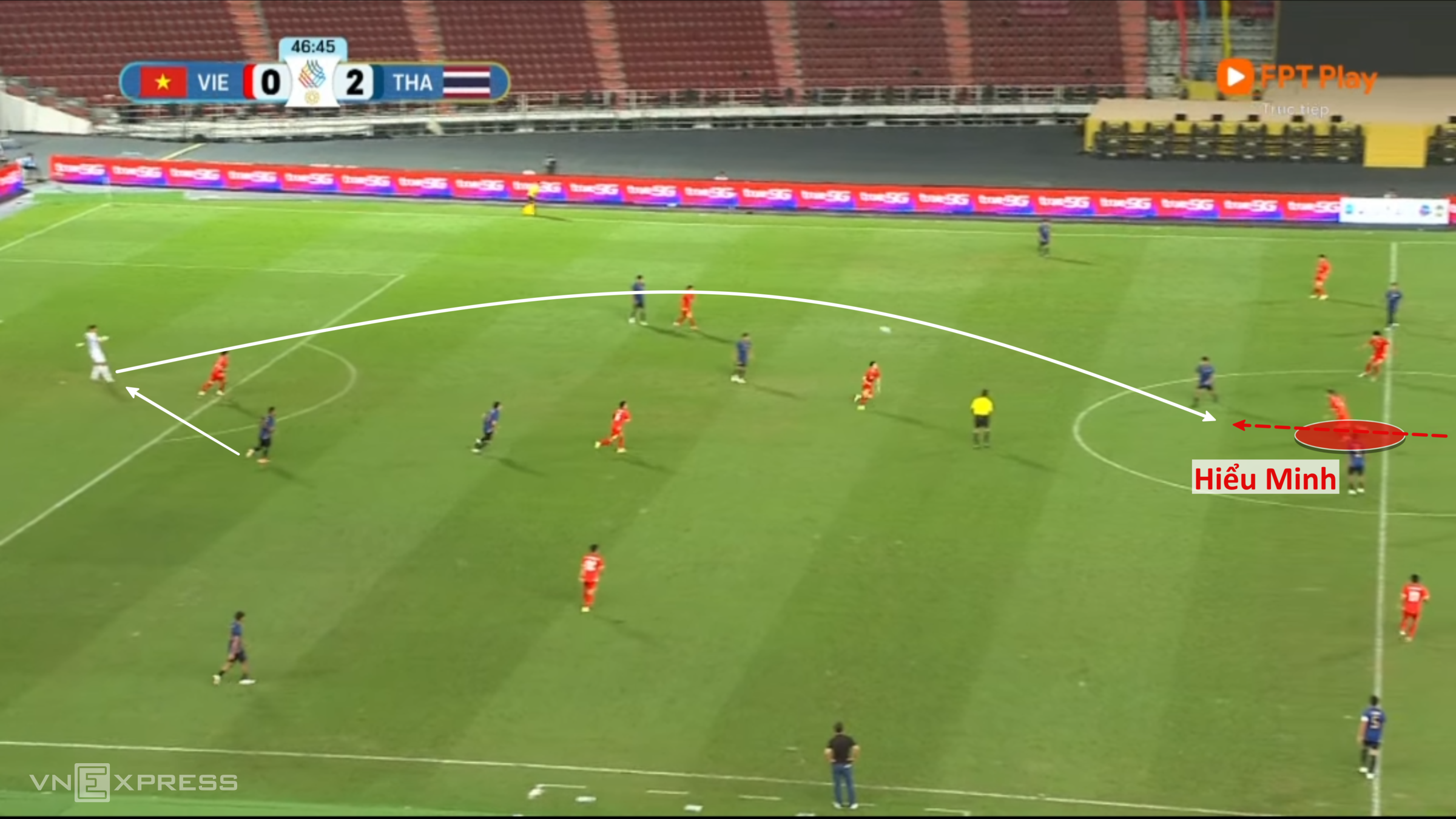 It was this energetic pressing from the front that forced goalkeeper Sorawat to opt for a long ball. Vietnam's defensive line pushed up closer to the halfway line, narrowing the distance between lines, which allowed center-back Hieu Minh to easily clear the ball.