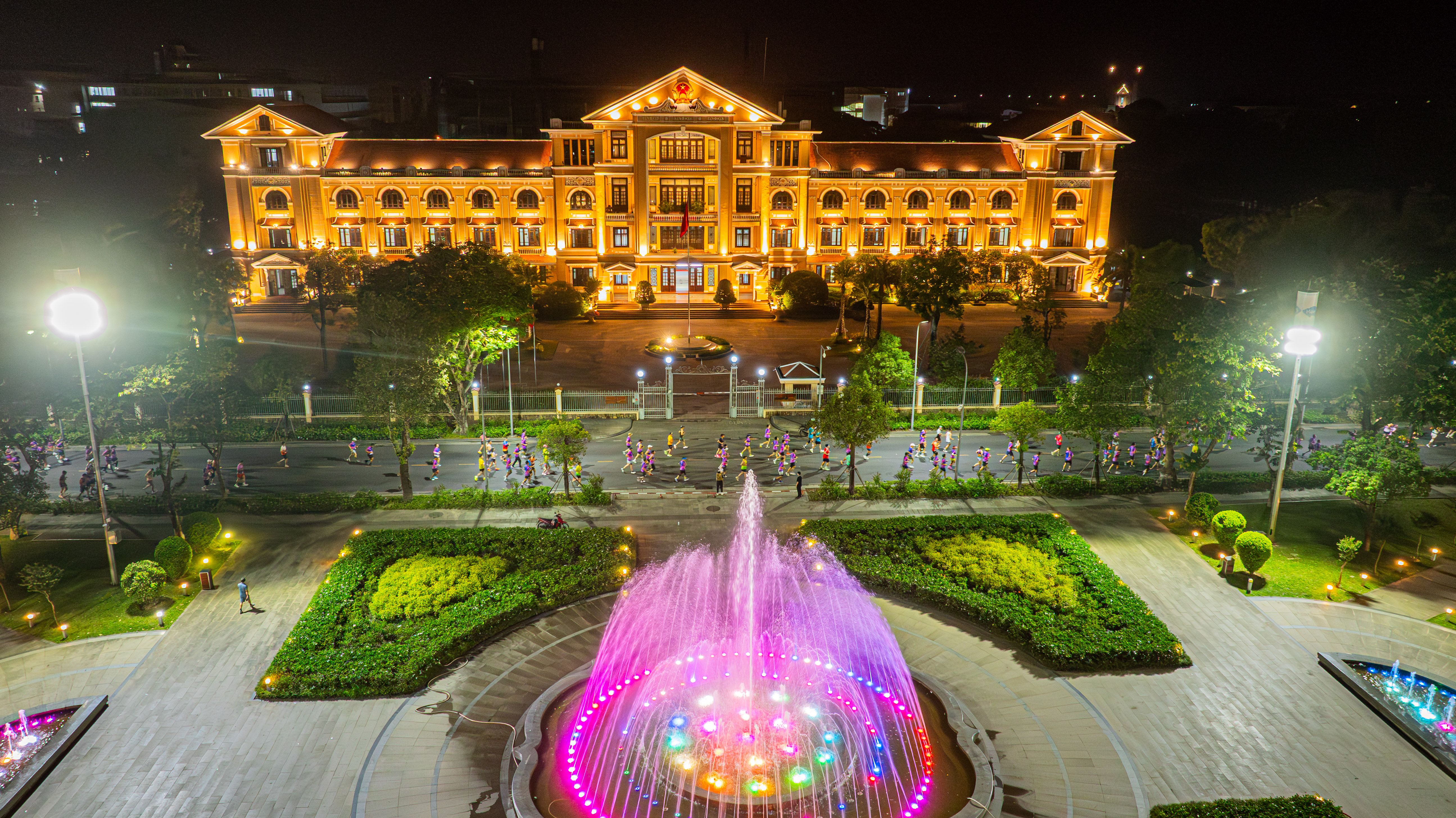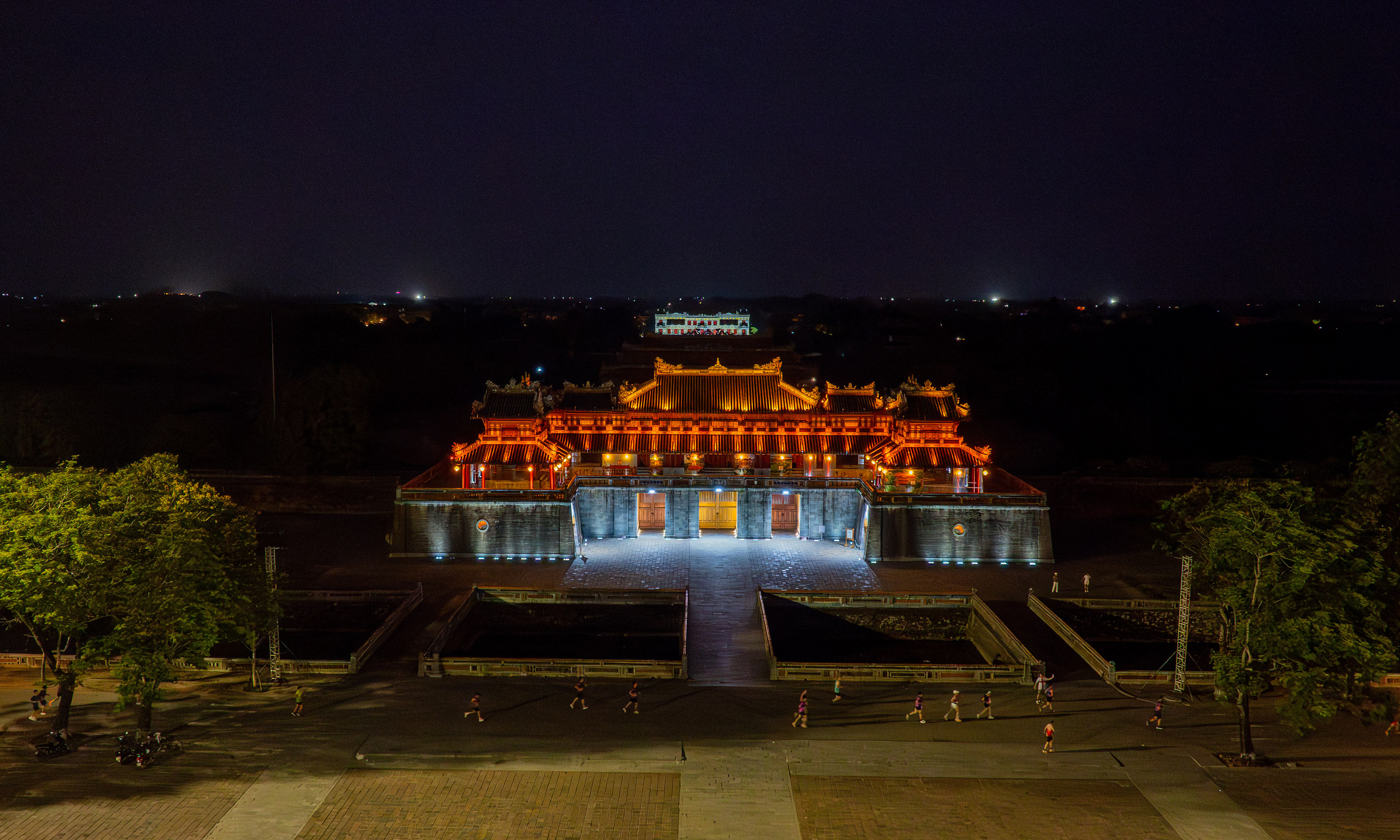 The Hue City People's Committee headquarters, brightly illuminated, was one of the striking landmarks greeting runners before dawn. |
