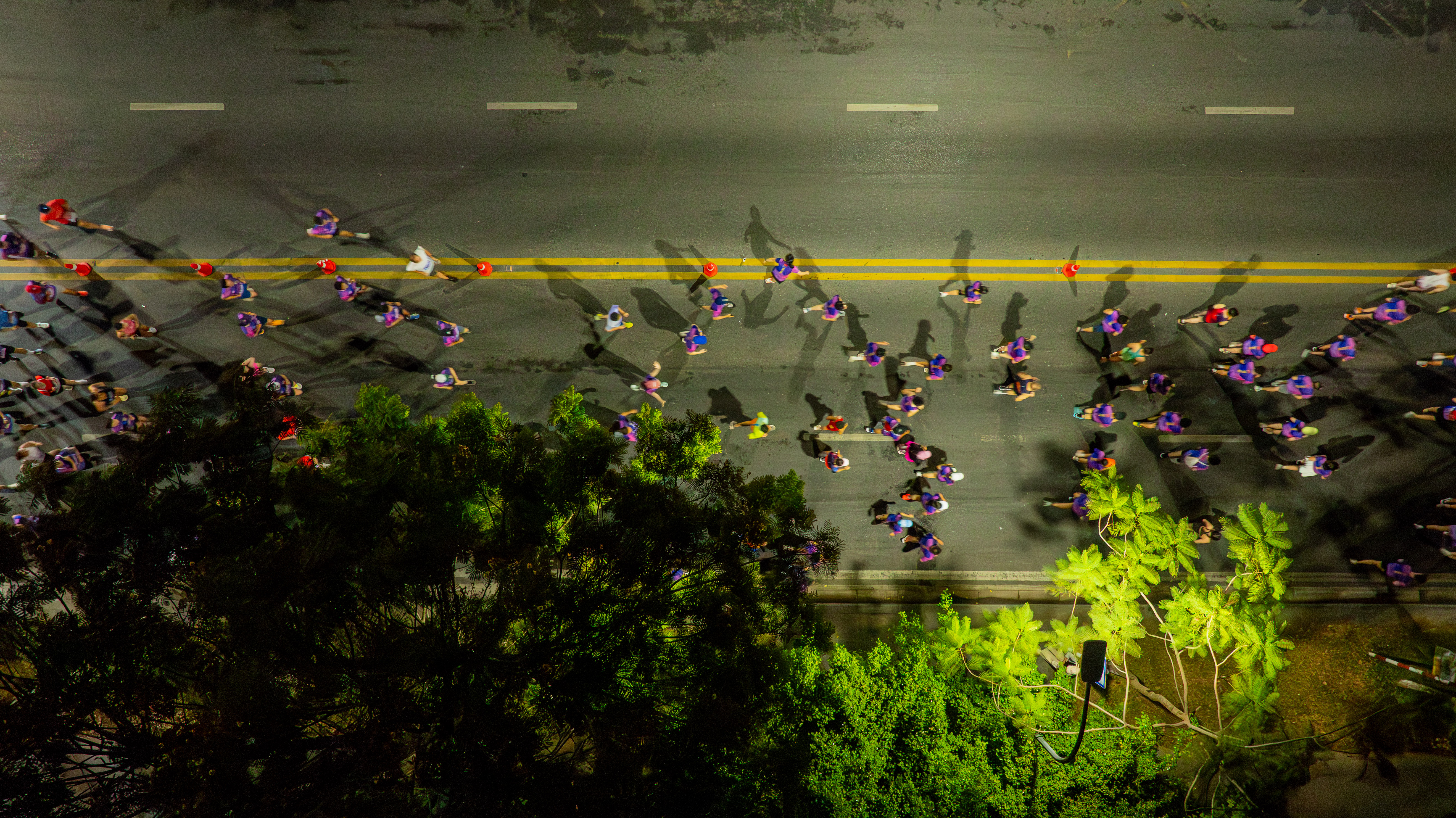 Starting at 4 a.m., 21 km runners passed through the Imperial Citadel area, still brightly lit. This image conveys the race's message, "Stride into the Imperial City", as organizers temporarily paused the 42 km distance to ensure all routes remained within the heritage zone. |