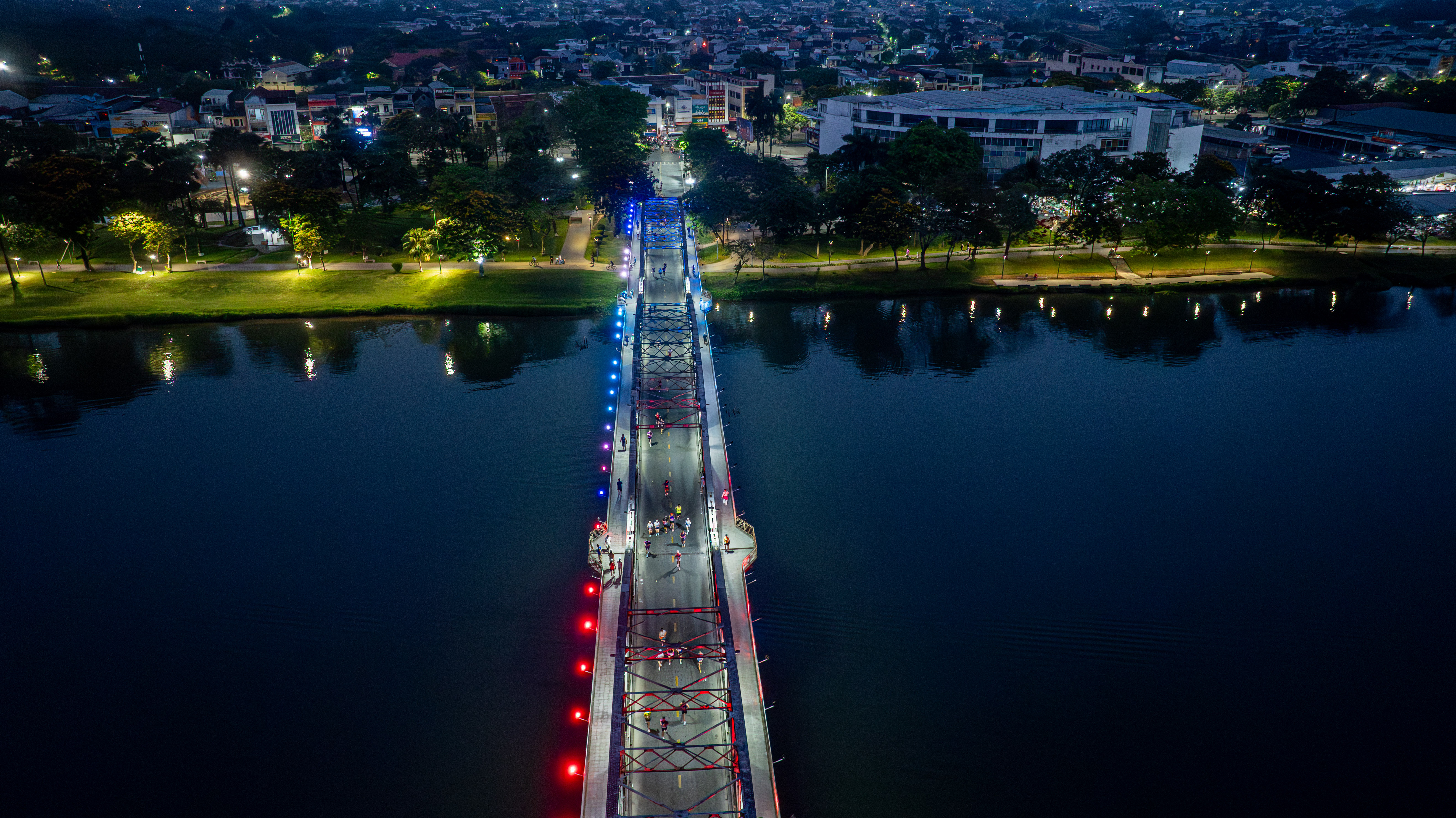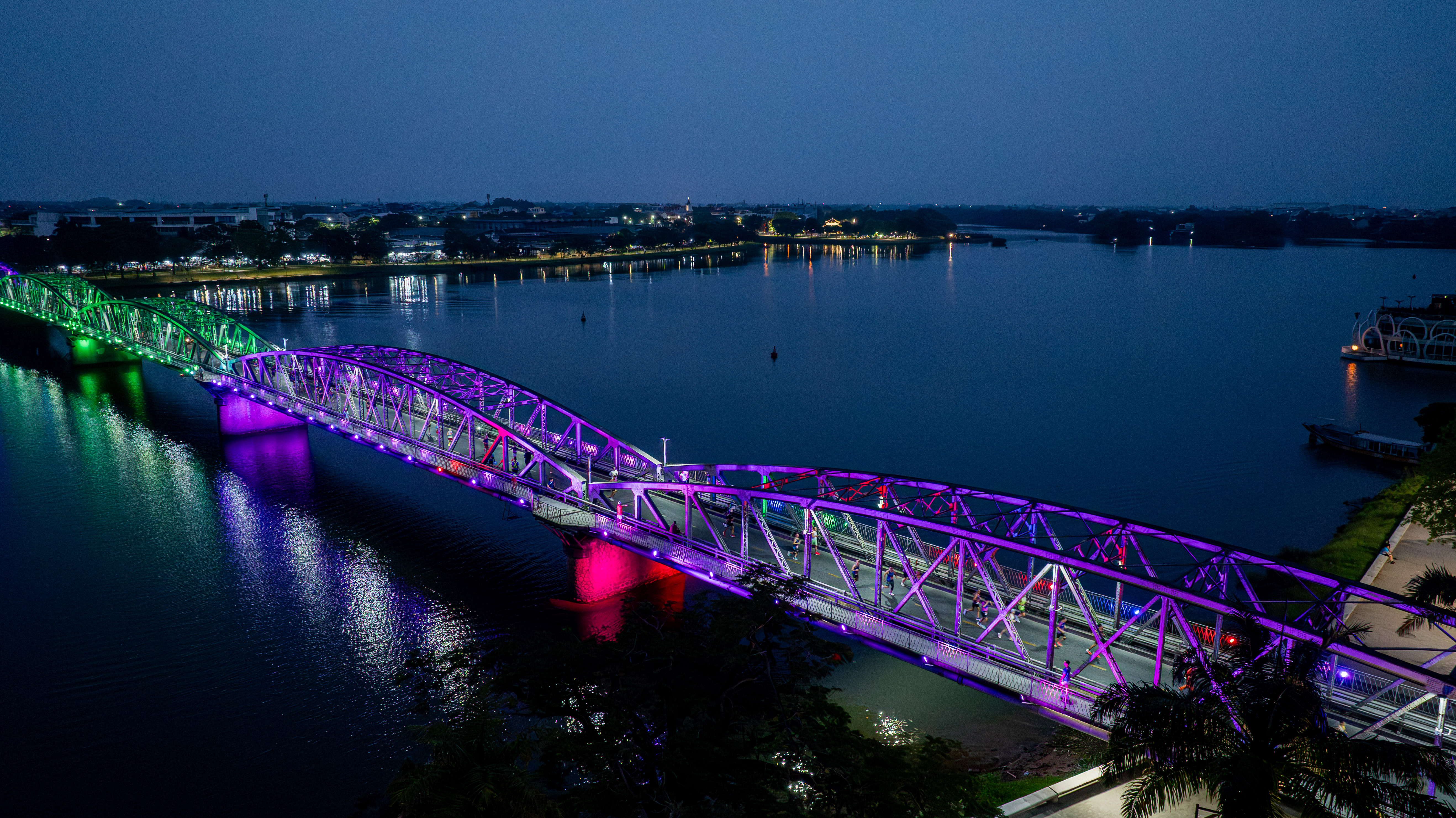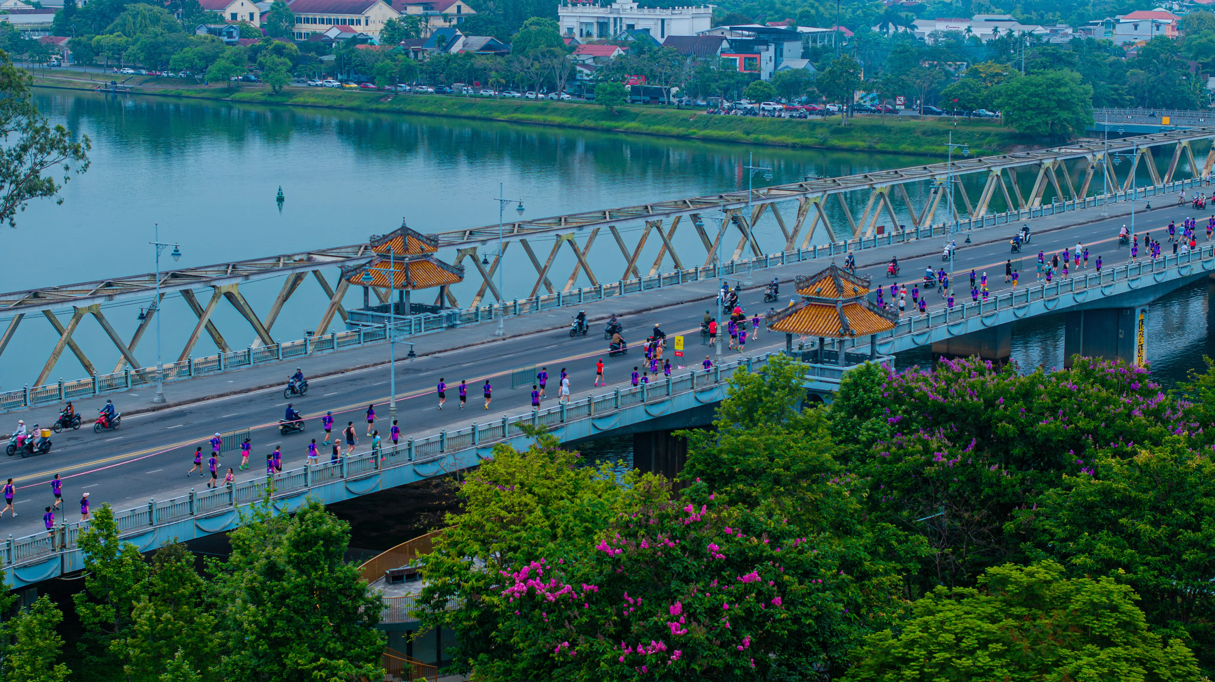 From the starting line at Phu Van Lau, the crowd continued across Truong Tien Bridge, spanning the Perfume River. This bridge connects the ancient Imperial City with the new city center, offering a contrasting landscape for the runners. |