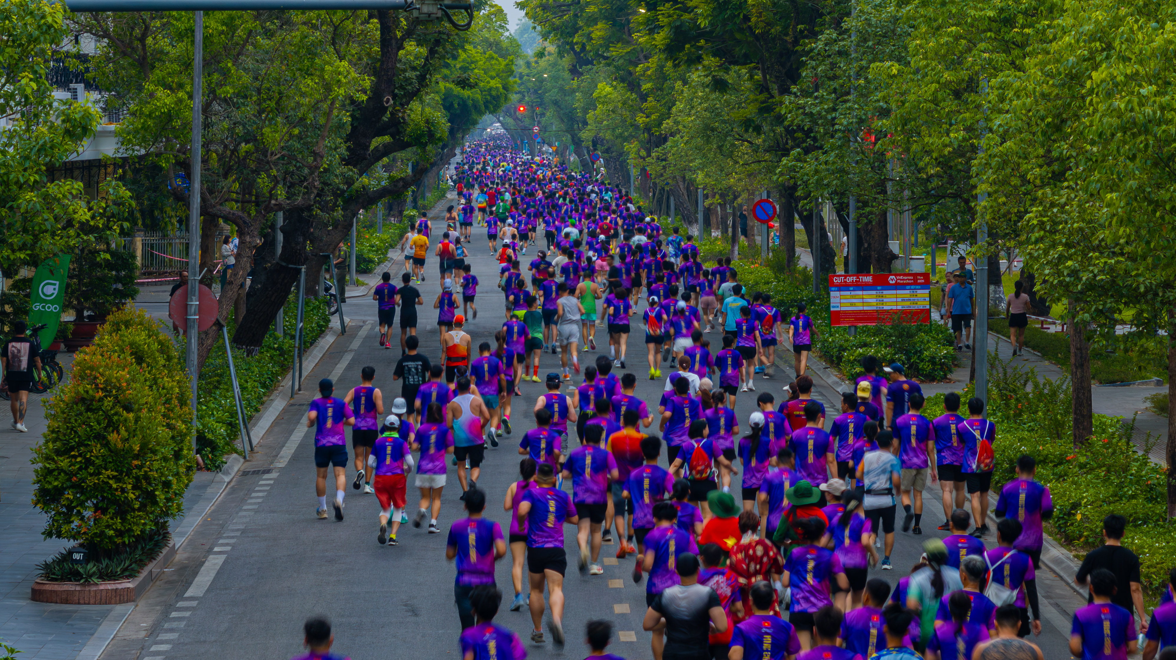 In addition to heritage structures, cool, tree-lined streets are a beloved feature of the VnExpress Marathon Hue. In the photo, a line of runners in the race's purple jerseys fills an inner-city street. |