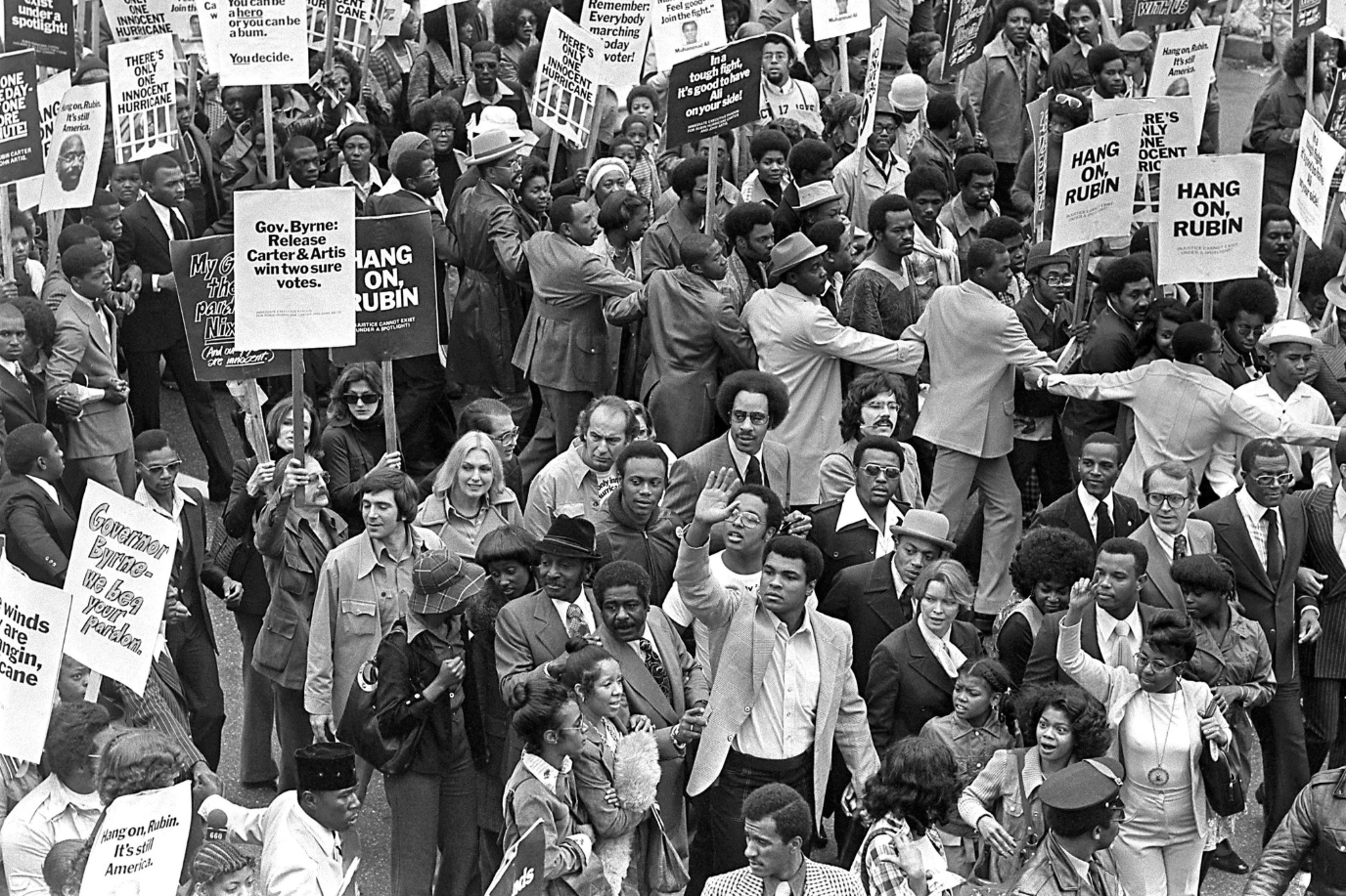 Boxing legend Muhammad Ali led a protest march in 1975 calling for the freedom of Carter and John Artis.