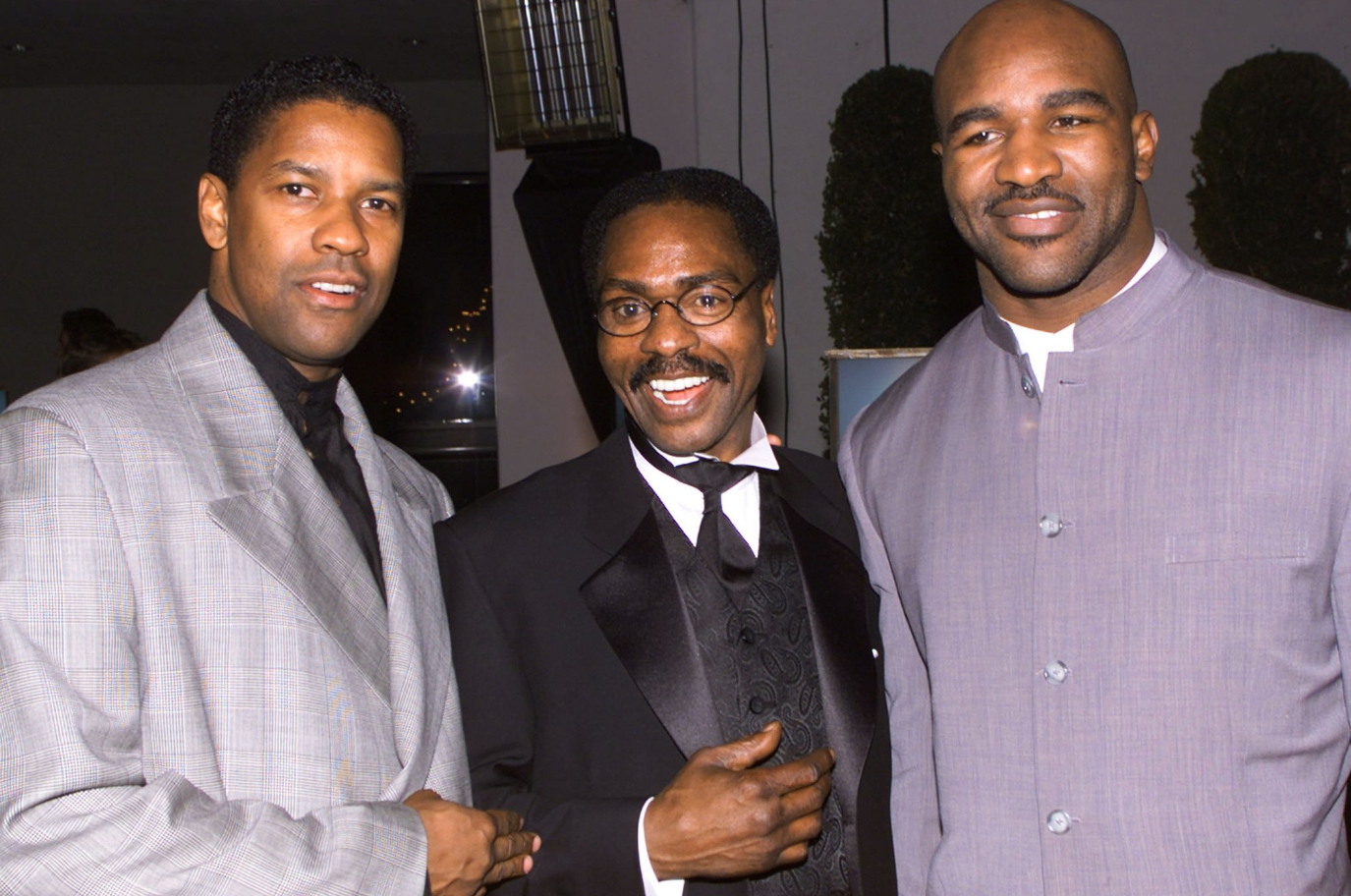 Rubin Carter (center), with American actor Denzel Washington (left) and heavyweight boxing legend Evander Holyfield at the premiere of "The Hurricane" in 1999. Washington received an Oscar nomination for his role in the film depicting Carter's struggles.