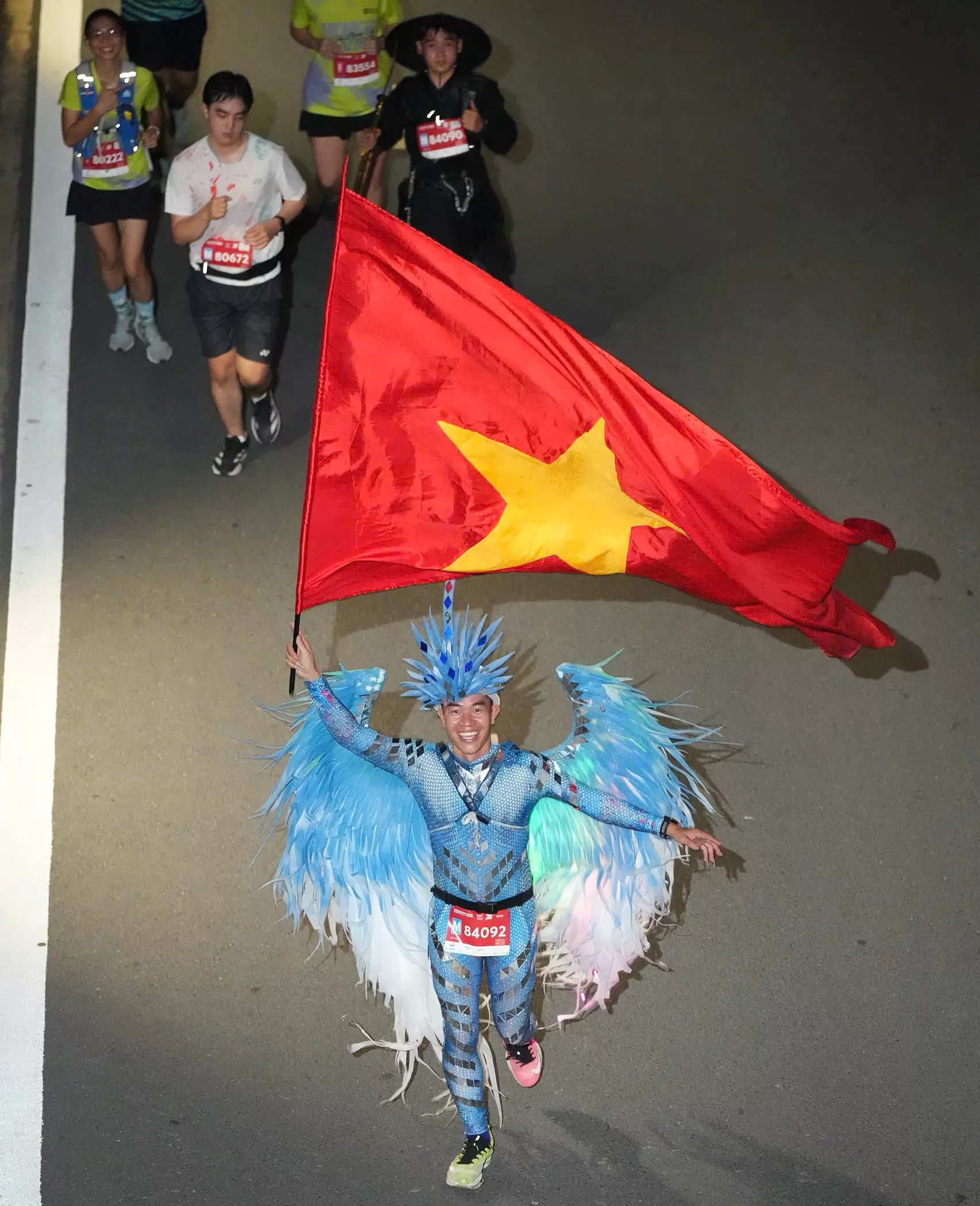The race also featured costumes with historical and cultural significance. Female runner Duong Nha Khoa dressed as a guerilla fighter, proudly carrying the national flag of Vietnam, adding a patriotic touch to the event.