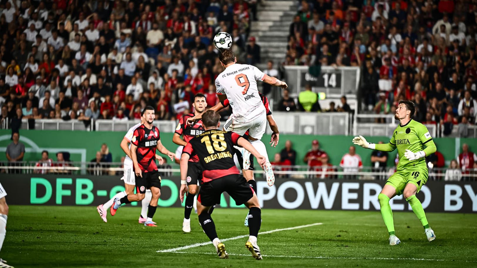 Harry Kane rises high to head in the winning goal, securing a 3-2 victory. Photo: FC Bayern |