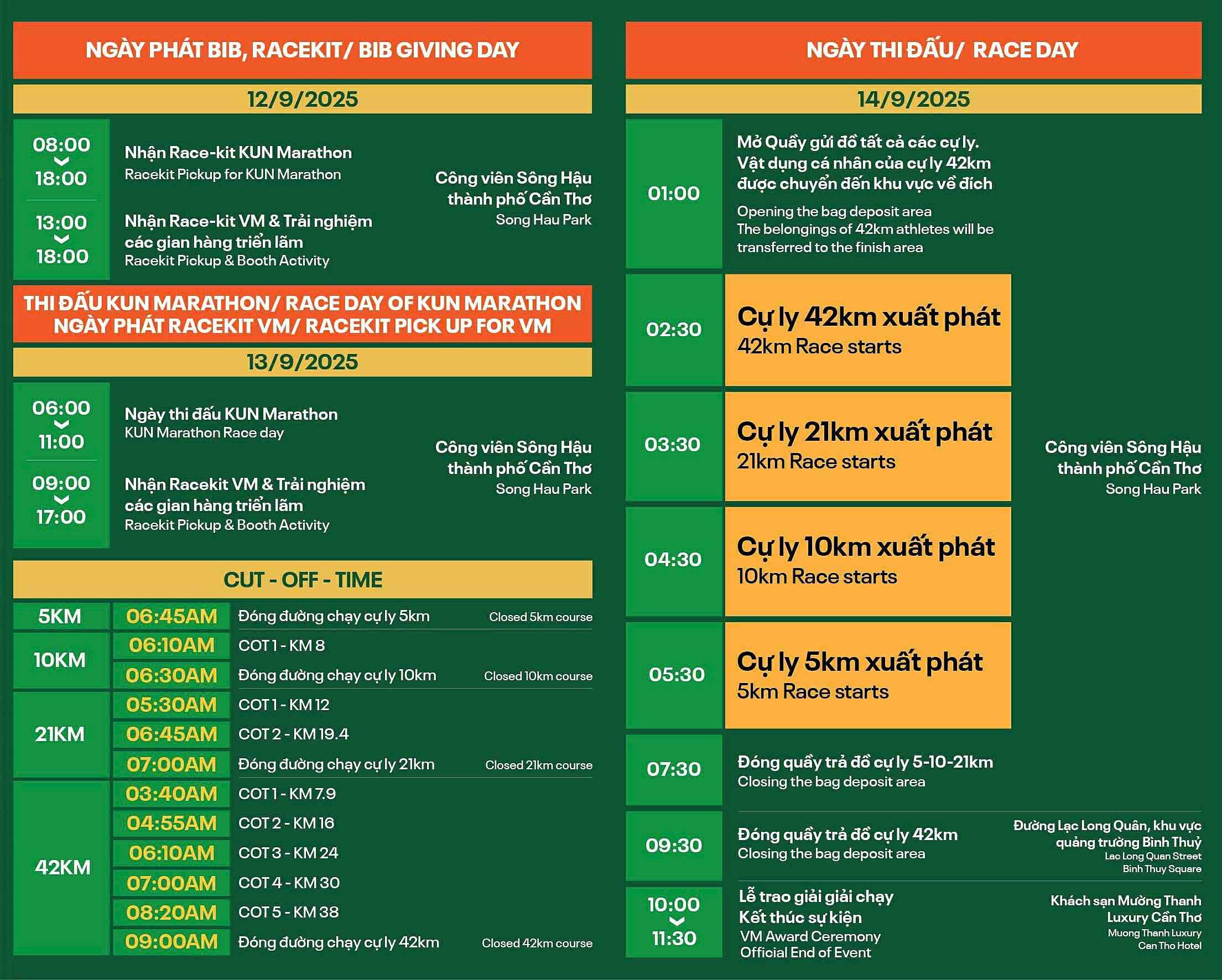 Race day, September 14, starts at 1 a.m. with the baggage check opening for all distances. The 42km race begins at 2:30 a.m., the 21km at 3:30 a.m., the 10km at 4:30 a.m., and the 5km at 5:30 a.m., all from Song Hau Park. Runners should arrive at least 30 minutes before their start time for check-in, warm-up, and to avoid missing their race.