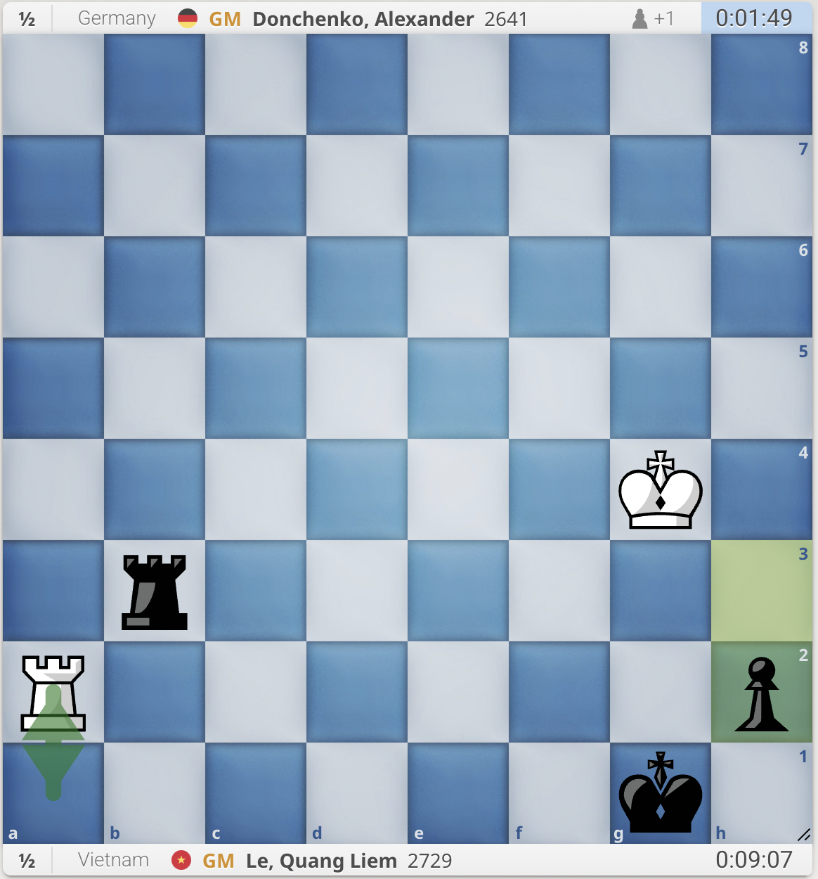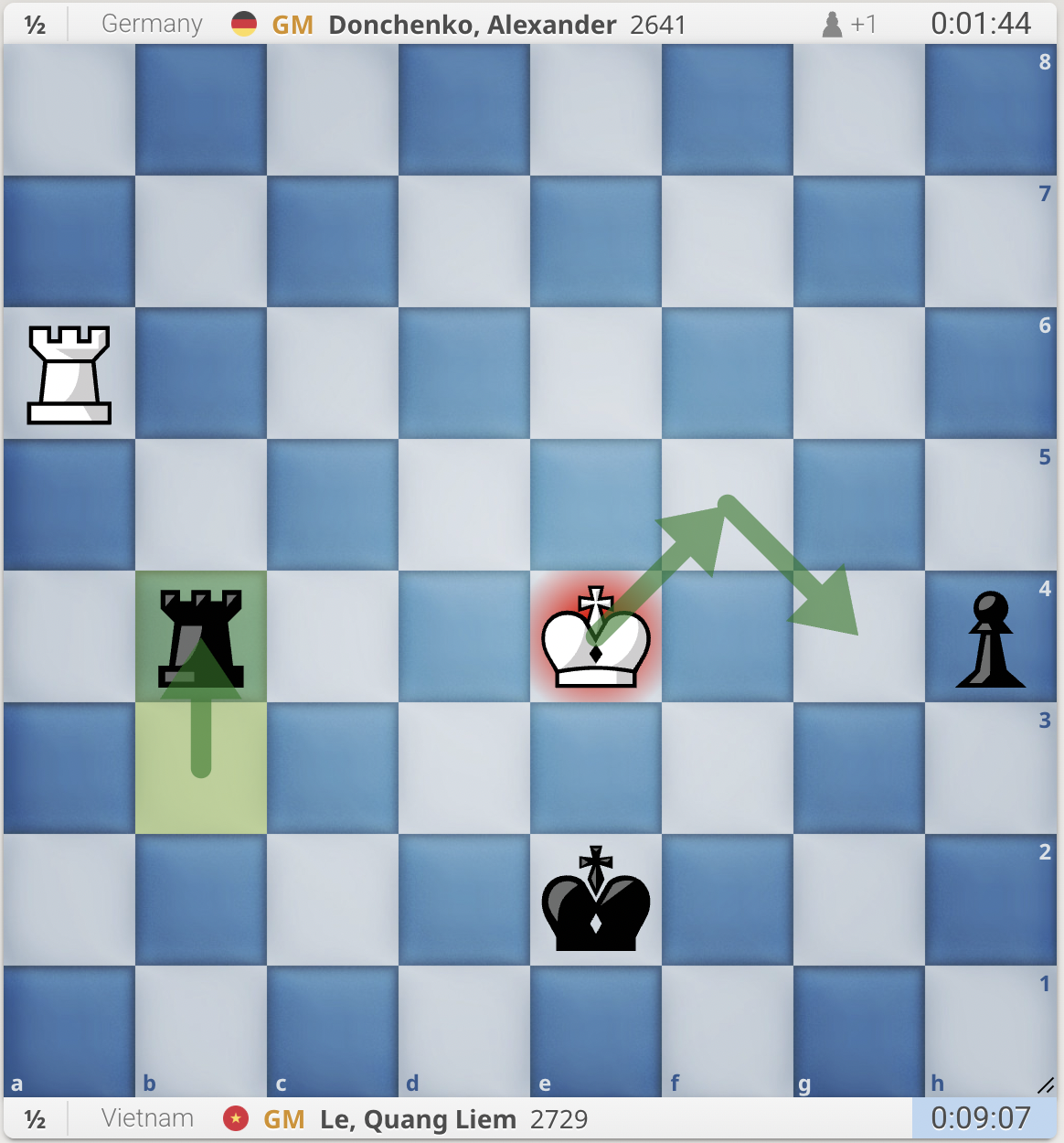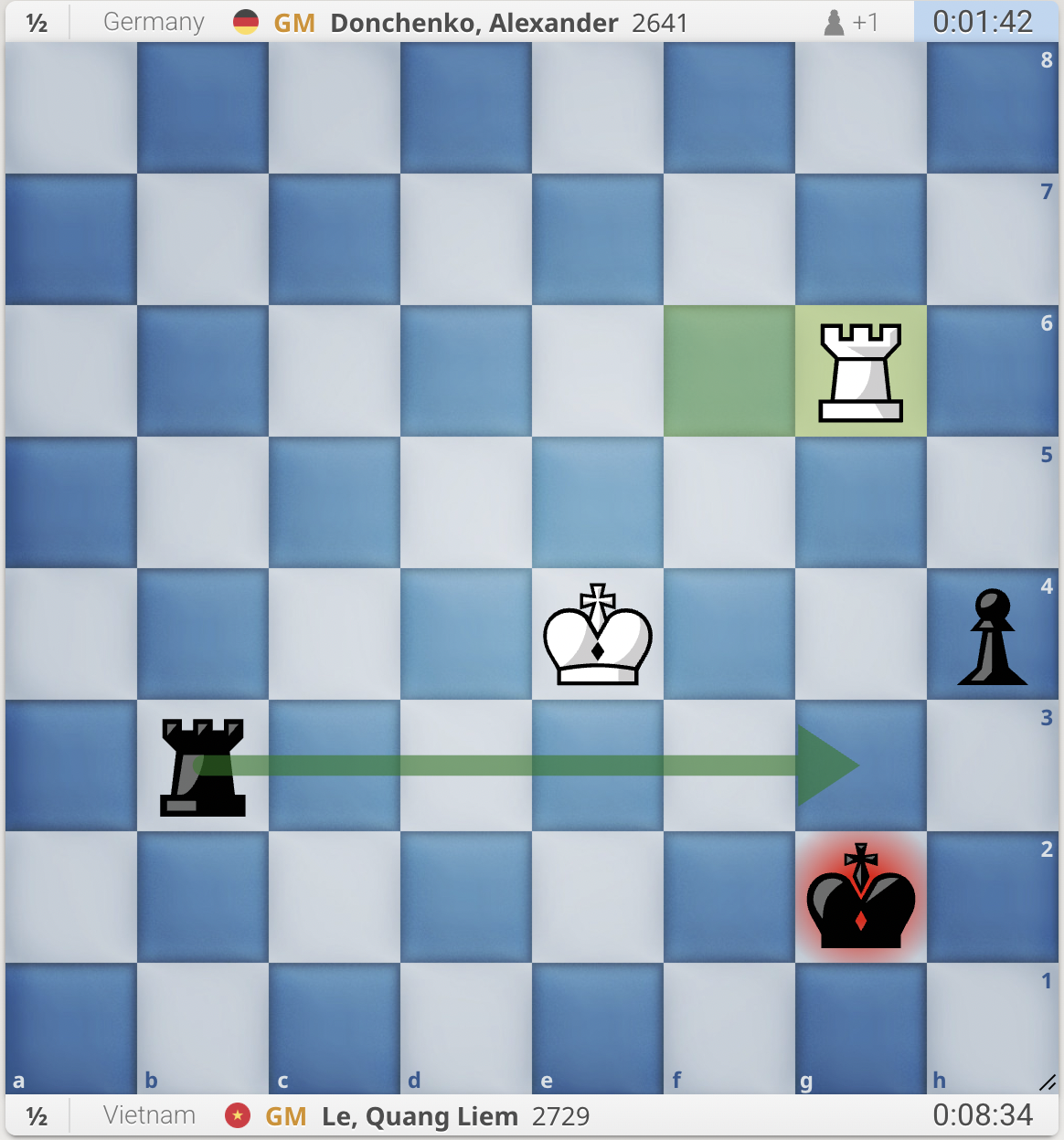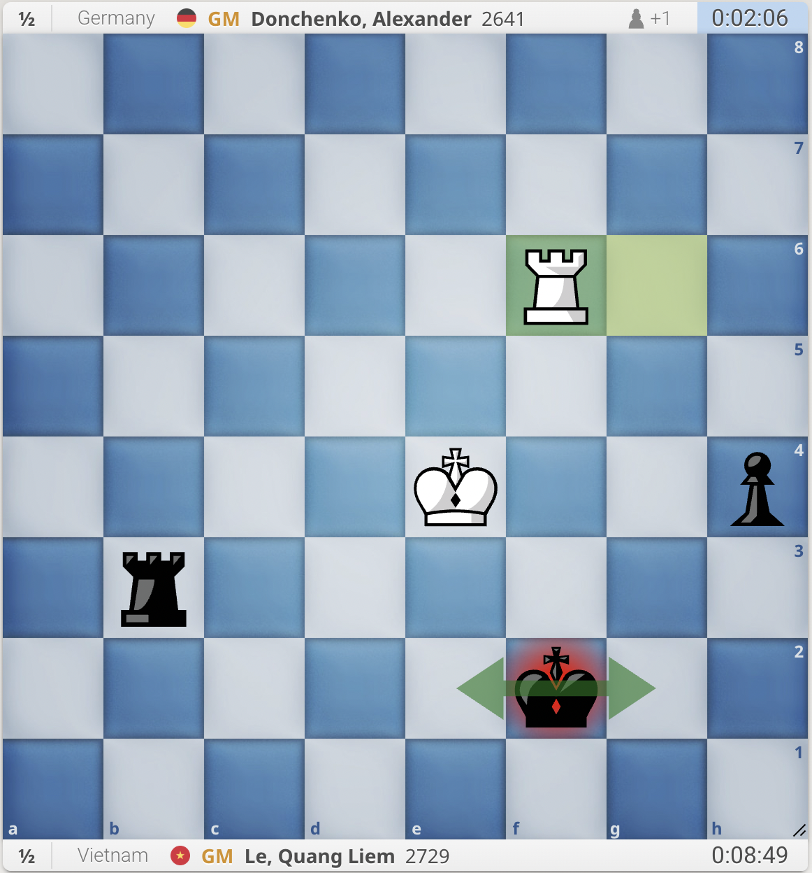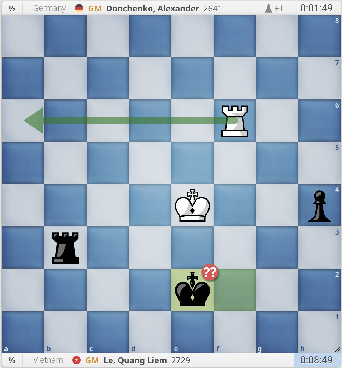 The board after 69.Rf6. Le Quang Liem had just delivered consecutive checks with his rook on g6 and f6, posing a question to Donchenko on whether to move his king to g2 or e2.