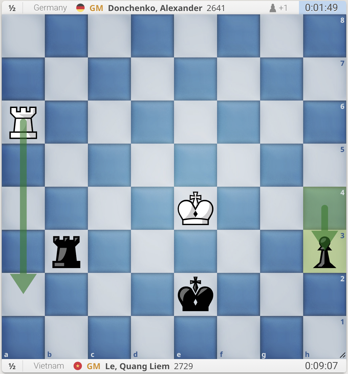 The Vietnamese representative tried to play quickly to pressure Donchenko on time, hoping for a mistake. In standard chess, grandmasters rarely miss a two-pawn advantage in a rook endgame. However, Donchenko failed to see the optimal moves, making a critical error on move 69.